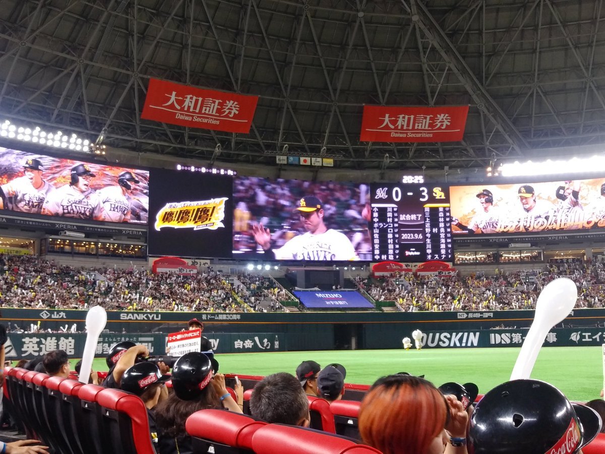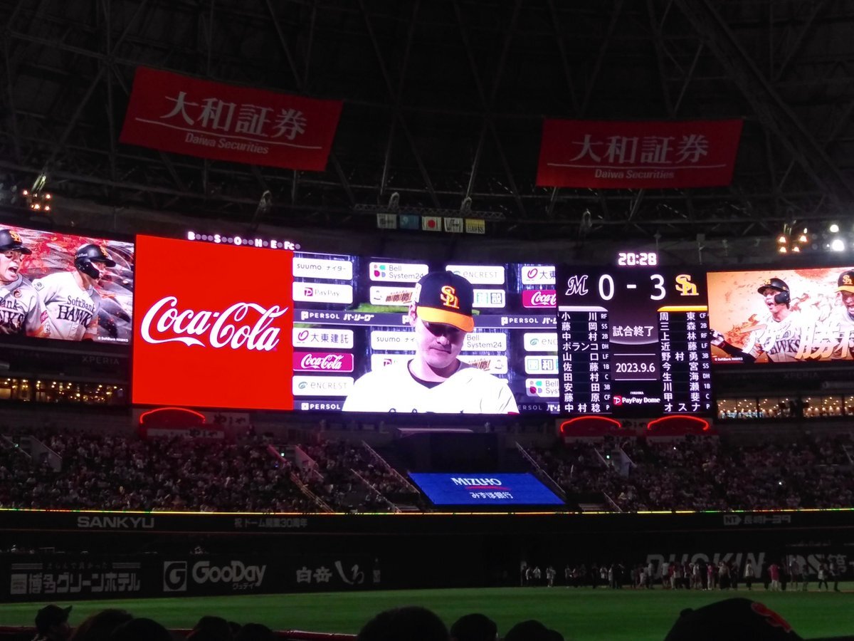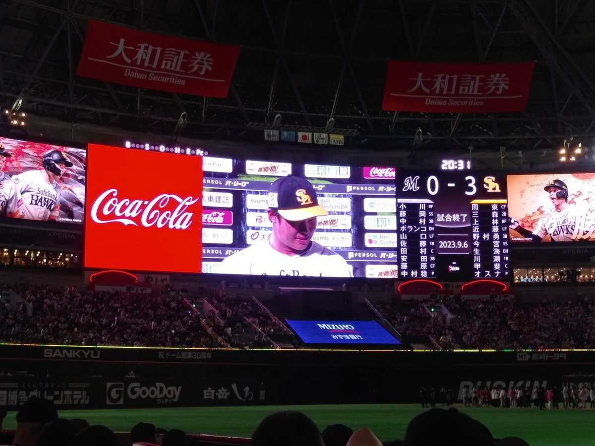 この試合はホークスが勝ち有原航平、井上朋也がヒーローインタビュー受けました。 #PayPayドーム #鷹鷹鷹 #有原航平 #井上朋也 #ヒーローインタビュー pic.x.com/dh48PeDCsA