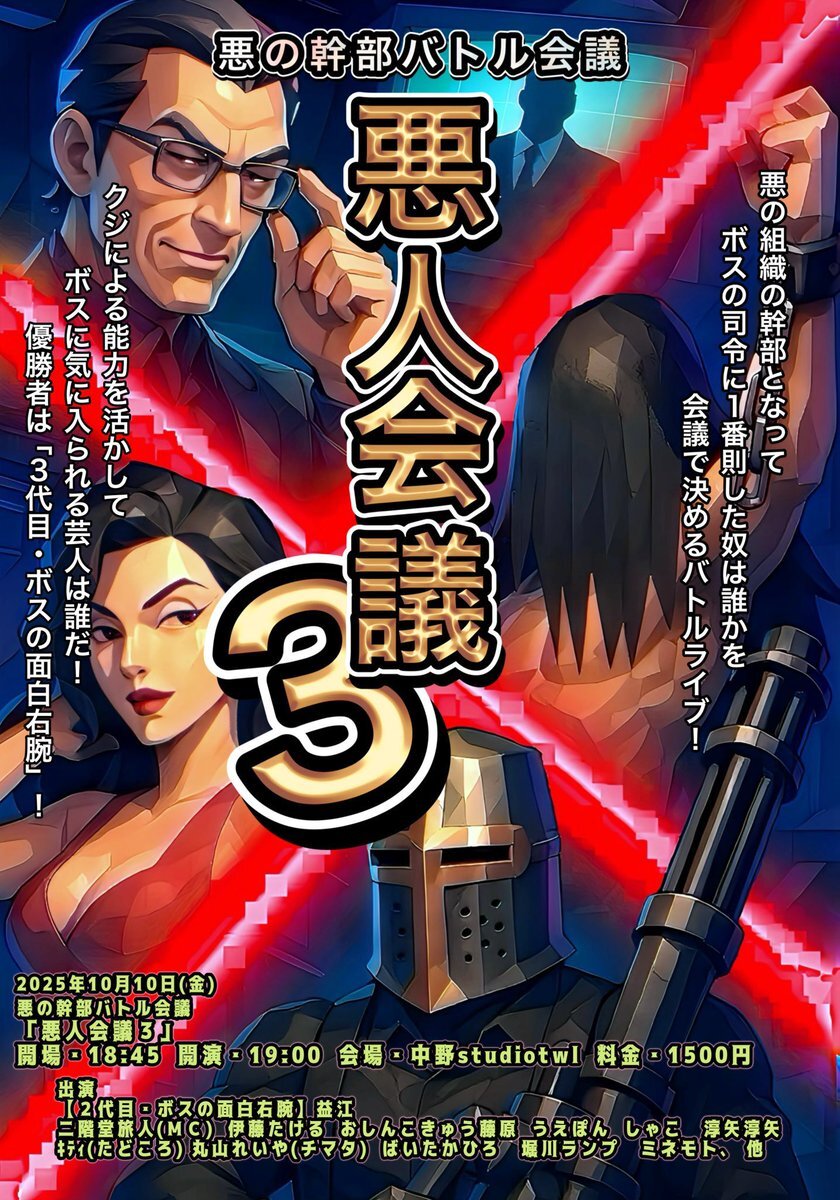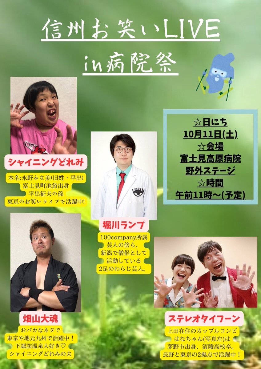 畑山大魂今後の予定① 10/10(金)悪の幹部バトル会議「悪人会議3」《企画大喜利》 開場18:45 開演19:00 会場 中野studiotwl 料金1500円 10/11(土)富士見高原病院祭お笑いステージ《長野遠征》 時間10:00〜14:00の間で45分 会場 富士見高原病院(長野県諏訪郡富士見町落合11-100) 入場無料 pic.x.com/WXMsPAQa9i