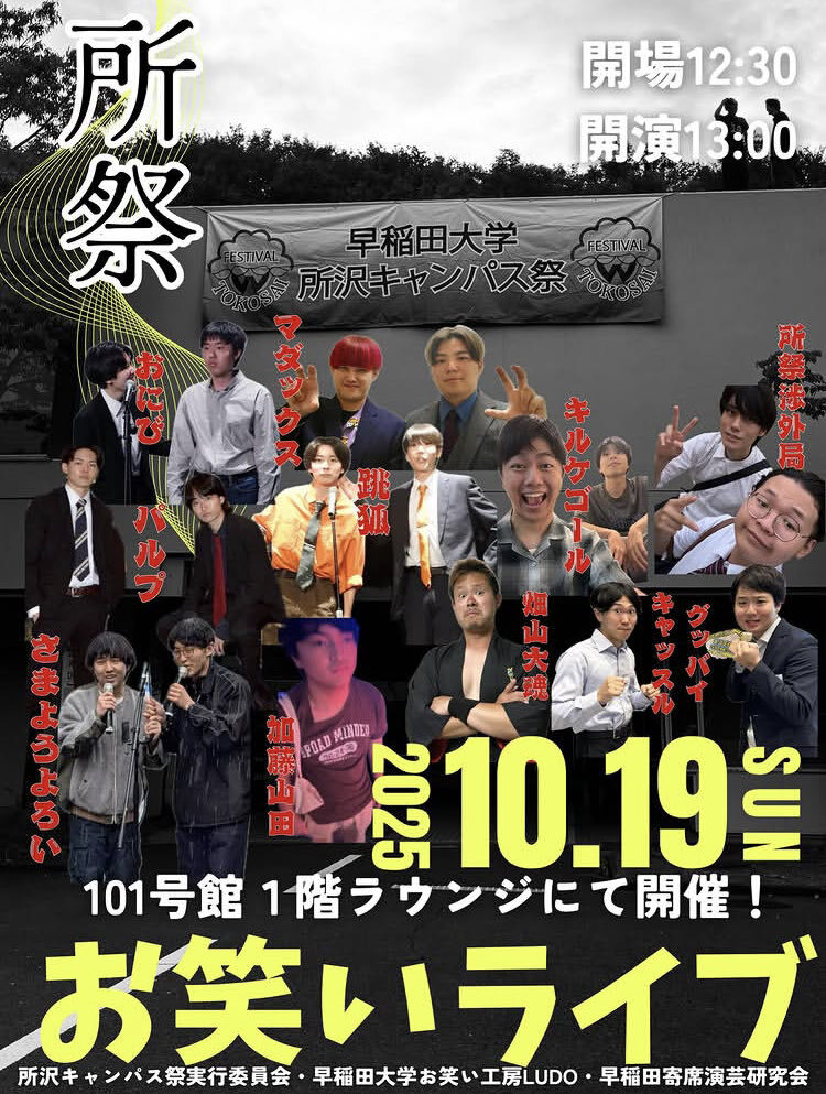 畑山大魂今後の予定② 10/19(日)所祭お笑いライブ《学園祭》 開場12:30 開演13:00 会場 早稲田大学所沢キャンパス101号館1階ラウンジ 入場無料 10/24(金)闇ライブ《ネタ過激企画》 開演21:30 会場 新宿ブリーカー 料金1000円 pic.x.com/1BHfvlgpGZ