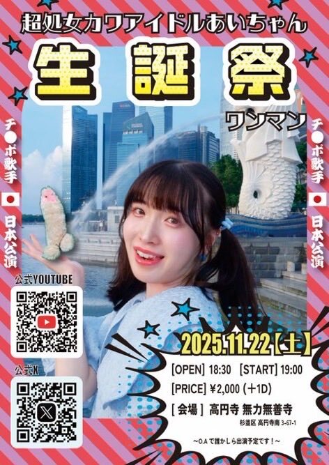 畑山大魂今後の予定③ 10/25(土)ガヴァドン月一ライブ《ネタ》 開場 17:50 開演 18:00 会場 新宿@Home shotbar BJ 料金1,000円(1ドリンク+お菓子2品) 11/22(土)超処女カワアイドルあいちゃん生誕祭前説ネタコーナー《アイドルライブ》 開場18:30 開演19:00 会場 高円寺無力無善寺 料金2000円+1D pic.x.com/gsekvEAQg6