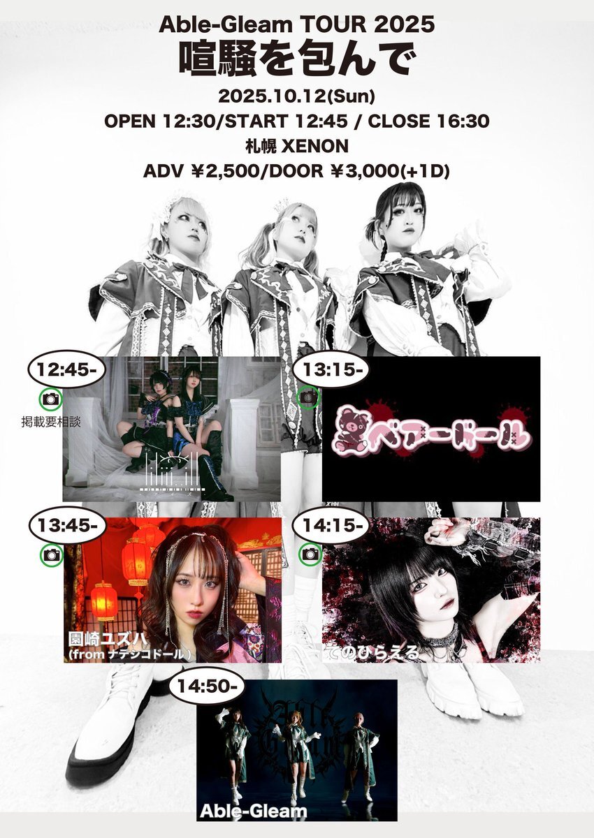 【#拡散希望】 ●Able-Gleam tour 2025 喧騒を包んで ⛄️札幌編⛄️ ① 2025.10.12(日) 札幌XENON 🎫tiget.net/events/429792 💃えいゔぁるぐりーむって?↓ lit.link/ablegleam 🎧サブスク tunecore.co.jp/artists/able-g… #Able_Gleam #アイドル #ラウドロック #初めての札幌遠征 #拡散で応援したい