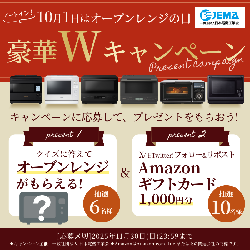 / 今年も開催🎊 #最新オーブンレンジ や #Amazonギフトカード が当たるチャンス❕ \ ✨2025年度「オーブンレンジの日」キャンペーン✨ 📮応募方法 【X限定】 ① @Ovenrange_1001 をフォロー ② この投稿を「#10月1日はオーブンレンジの日」をつけて引用ポスト 📨12月中旬にDMで当選案内
