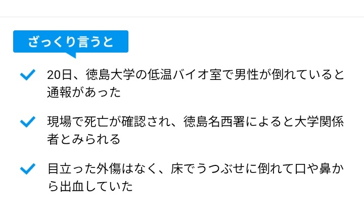 返信先:@kitsugon3徳島大学の低温バイオ室での事件は、10月20日に20代男性(特別研究学生)が死亡。原因はドライアイスによる二酸化炭素滞留での酸素欠乏とみられる。大学は10月28日の会見で、周知不足を認め謝罪。以降の更新なし。詳細は公式サイト参照。