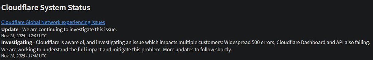 どうやらcloudflareっていうセキュリティ関連のAPI周辺で障害が発生して、それを導入している多くのサイトやアプリが使用不能になっている。 「続行するには、challenges.cloudflare.com のブロックを解除してください。」