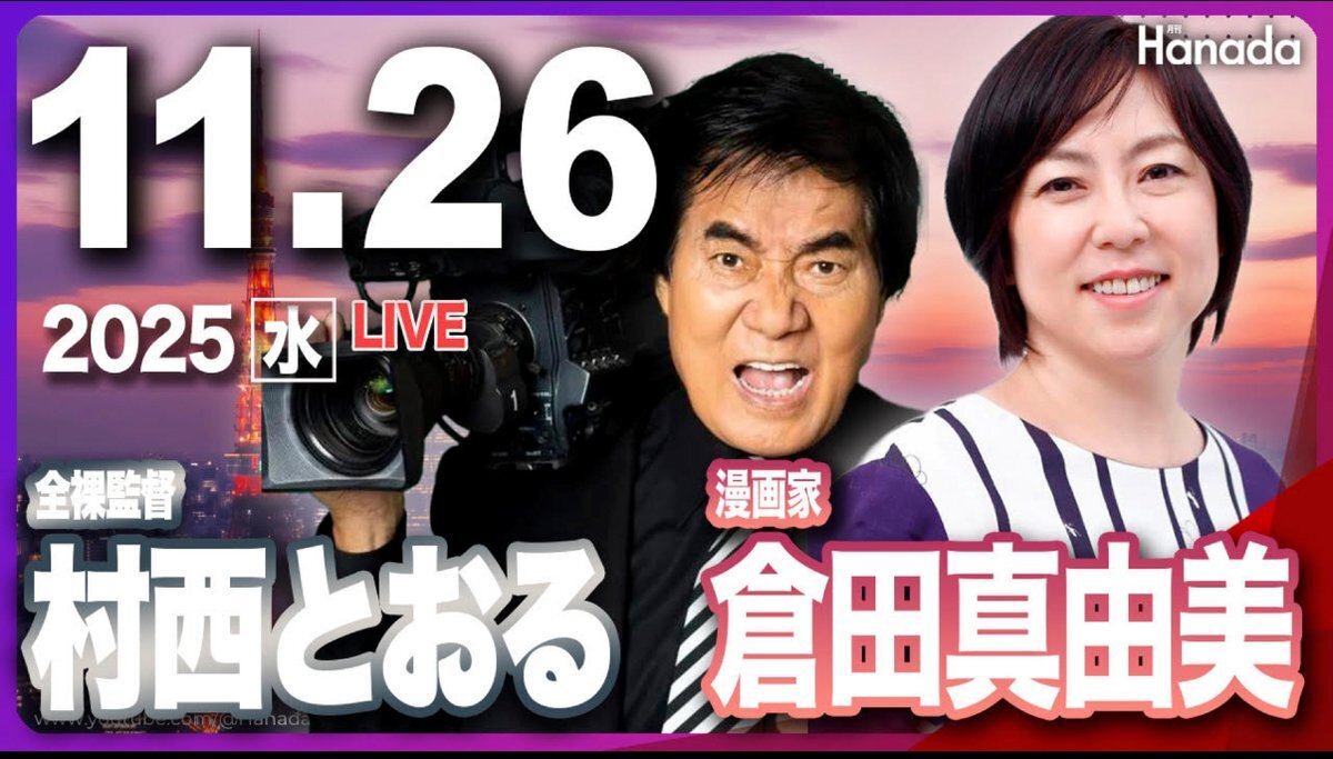 【明日20時スタート!】 明日の「月刊Hanadaチャンネル」のゲストは、漫画家の倉田真由美さんと、全裸監督こと村西とおる監督です。 「オールドメディア×リベラル×フェミニスト──その欺瞞を暴く!」 明日もタブーなし! ▼ニコ生 live.nicovideo.jp/watch/lv349258… ▼YouTube youtube.com/watch?v=xqNKXX… pic.x.com/BEBVxb9DiS