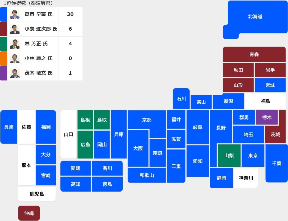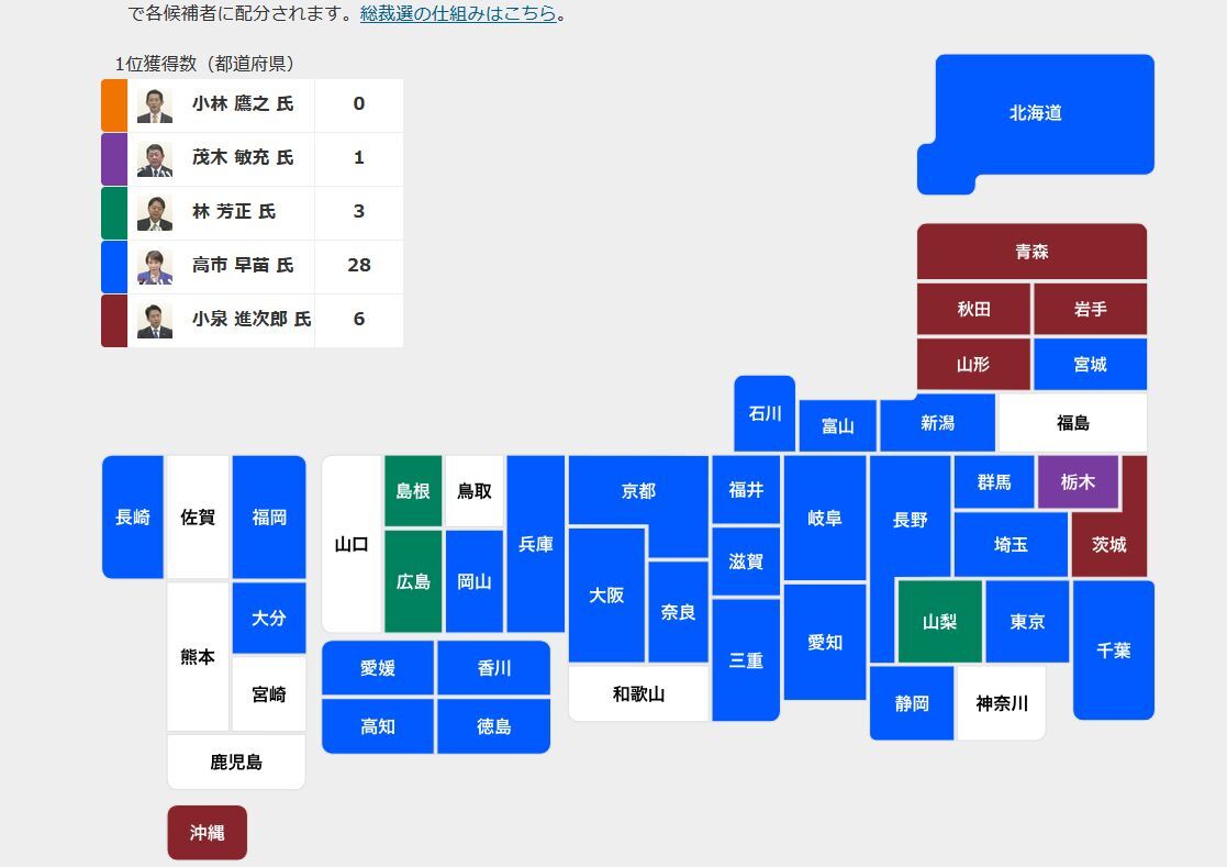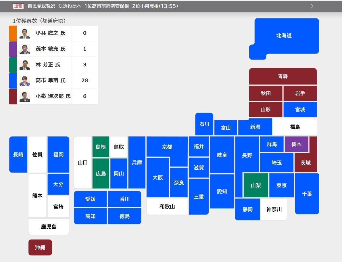 総裁選もう一回目の結果出たんだ。NHKの党員票開票ページばっか見てたから出遅れたw 党員票、高市119 小泉84かぁ。予想されていた範囲内だけどしっかり差はついてる。 林票が乗っかってしまったら進次郎だけど、党員の目をどれだけ意識するか…。