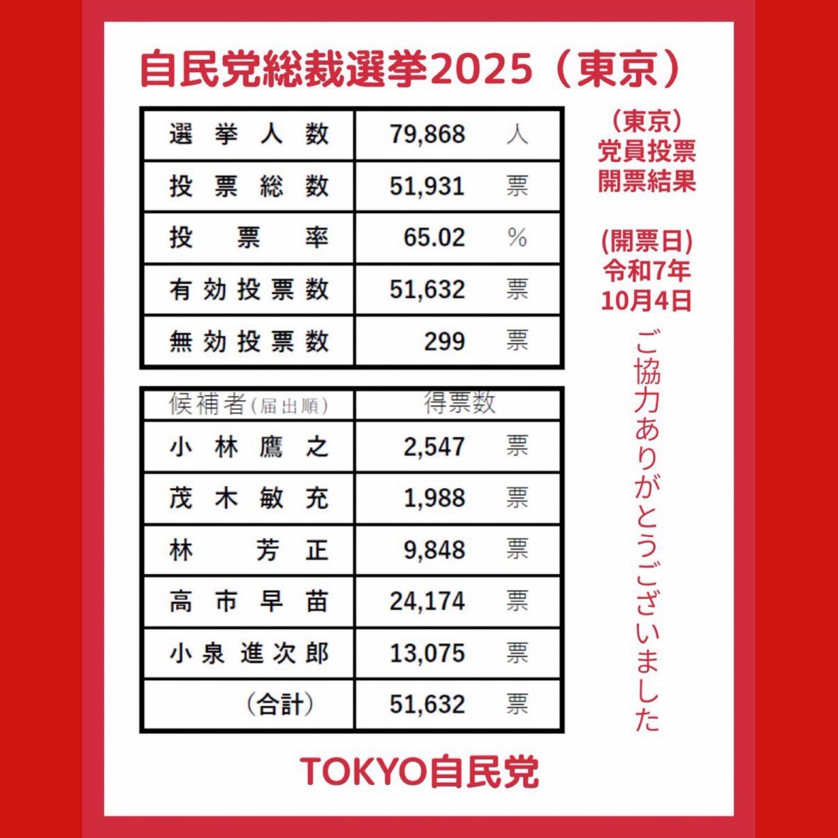 【ニュース】自民党総裁選の党員票開票が開始。北海道・東京・大阪を含む20以上の都道府県で、高市早苗氏がトップに立っていると報じられています。 ✅ポイント ・総裁選は国会議員票と党員票、計590票で決定。 ・高市氏が20超の都道府県でリード。小泉氏、林氏、茂木氏も一部地域で優勢。