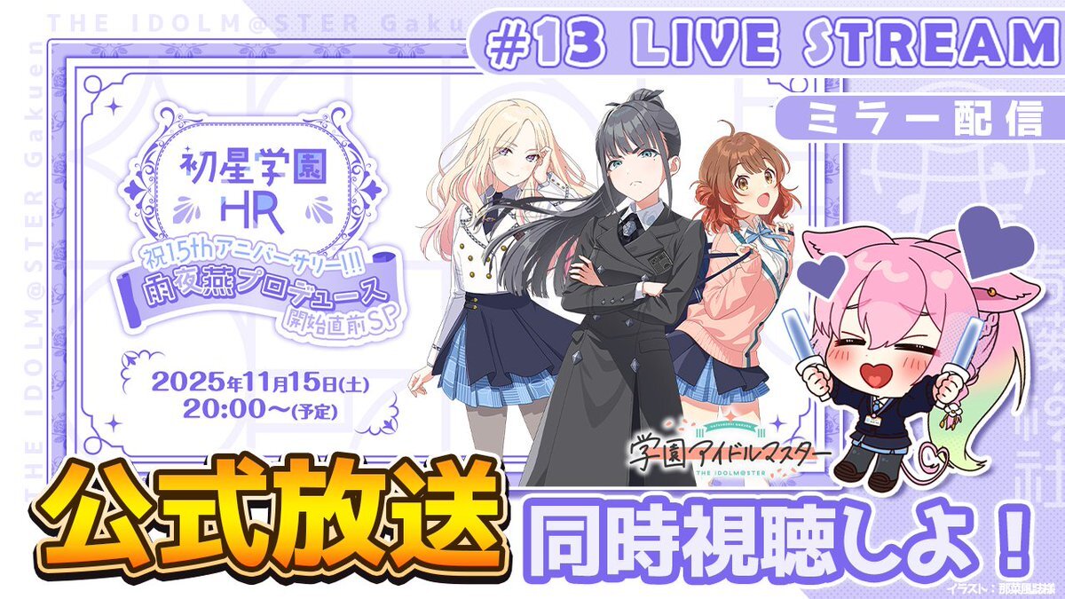 配信告知📣 11.15 (土) 19:45~ ※公式放送15分前に開始です💦 雨夜燕実装前夜、1.5周年もてんこ盛りな 初星学園HRを同時視聴しよう!💕 なんとミラー配信出来ます✨ 待機所は金曜夜に建てる予定! ぜひ一緒に盛り上がろう!! #学マス イラスト: #hanakamakiri723 那菜風誌様 pic.x.com/XeZAj5bcyi