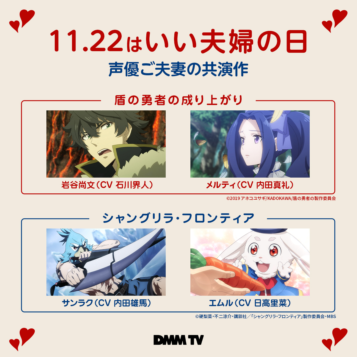 ╭━━━━━━━━━━━━━╮ 11.22は #いい夫婦の日💐🤍 ╰━v━━━━━━━━━━━╯ 声優さんご夫婦の共演作品を ピックアップしました! ——— • ✧『盾の勇者の成り上がり』 岩谷尚文(CV 石川界人) × メルティ(CV 内田真礼) ✧『シャングリラ・フロンティア』 サンラク(CV