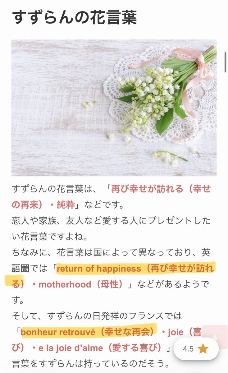 例のカレンダーのラッキーフラワーの花言葉を自己解釈 🚀…鈴蘭。「純粋」「母性」はまさに🚀。あとやっぱり外せないのは「再び幸せが訪れる」かな。彼女の「また明日!」にはきっとその意味が込められてる。「マリアの涙」も、大人🚀を彷彿として個人的にグッと来ます。