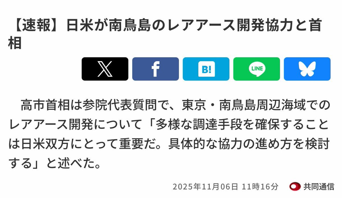 いやいやいやwwww 開発協力(笑)なんかしなくていいから自国だけでやれよwwww アメリカに9割くらいゴッソリ持っていかれるのが目に見えてるだろうがwww 【速報】日米が南鳥島のレアアース開発協力と首相