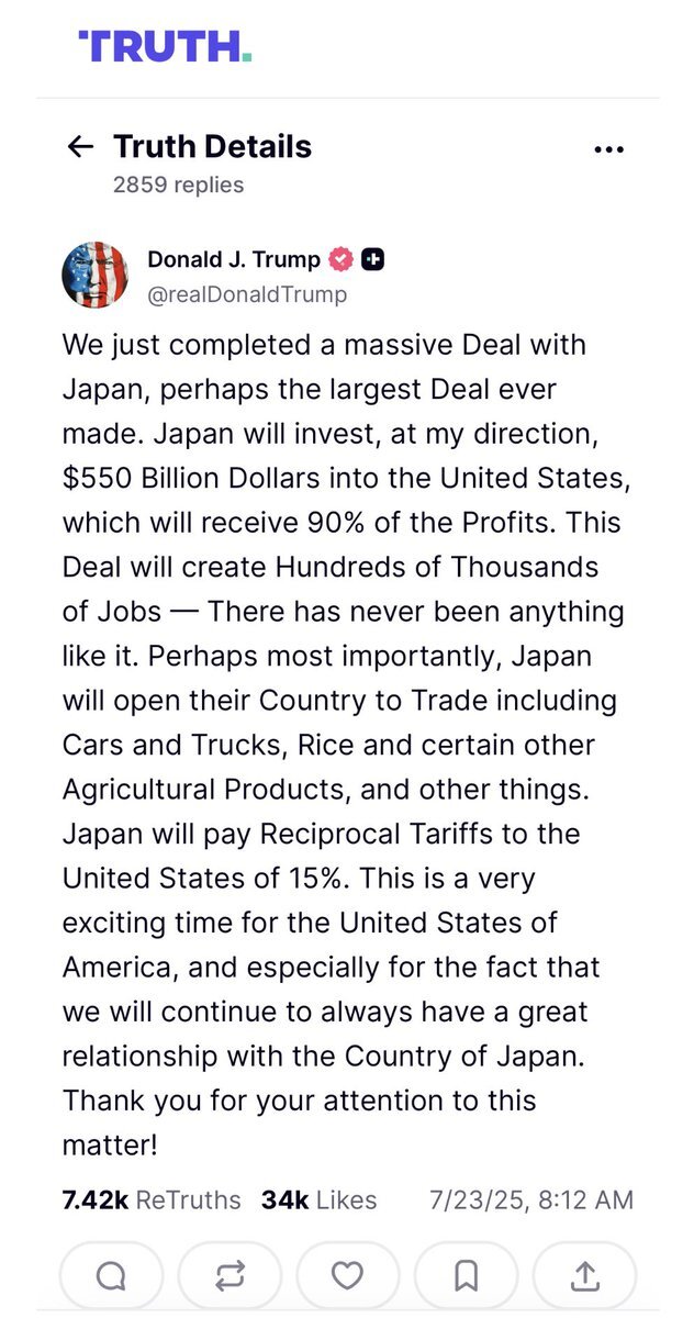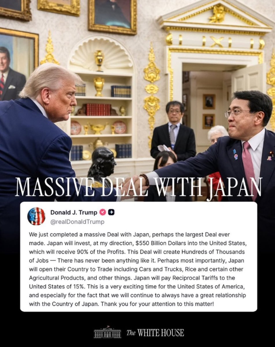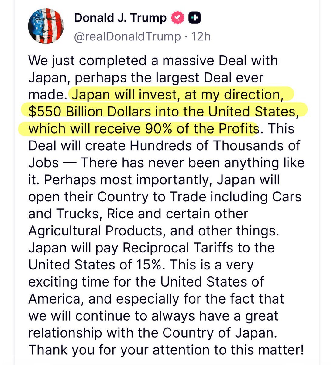 過去にやられてますからね。アメリカを信用してはいけません。 日本が米国に5500億ドル(約80兆円)を投資すると表明 利益の90%を米国が受け取る pic.x.com/ek8N0ad05p x.com/Ootani_Acid/st…