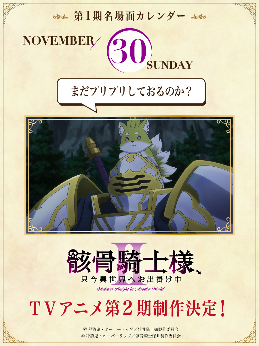 ◤ #骸骨騎士様 第1期 💀名場面カレンダー💀 ◢ 2025.11.30(日) アーク 「まだプリプリしておるのか?」 アリアン 「してない!」 アーク 「……。しておるよな?」 TVアニメ第2期制作決定✨ 『骸骨騎士様、只今異世界へお出掛け中Ⅱ』 skeleton-knight.com #骸骨騎士様2 pic.x.com/7IRr20OsYA