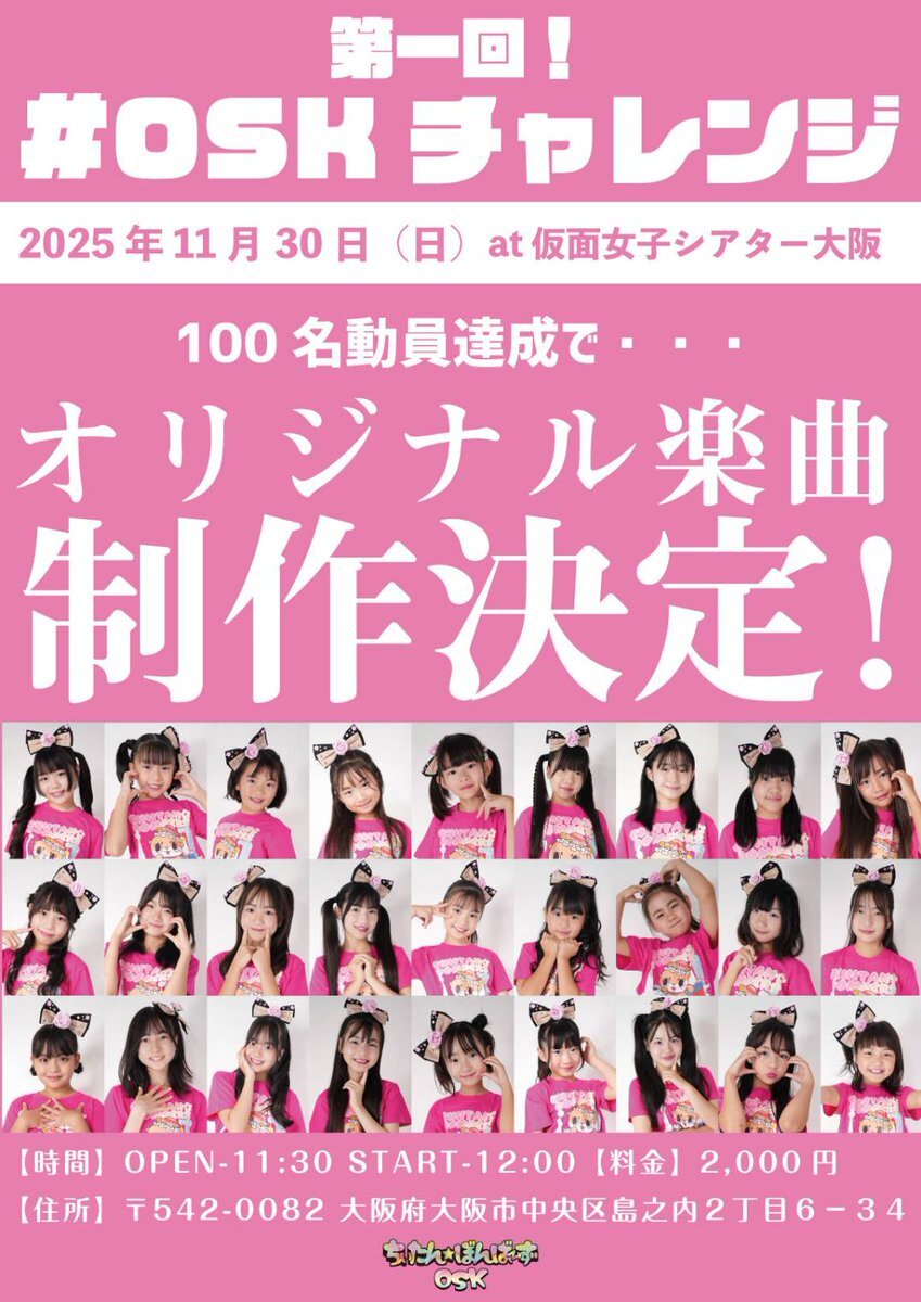 今日の現場、「第一回!#OSKチャレンジ 100名動員達成で・・・オリジナル楽曲制作決定!」@仮面女子シアター #ちぃたん☆ぼんばーずOSK #仮面女子シアター pic.x.com/IsnAdcds4q