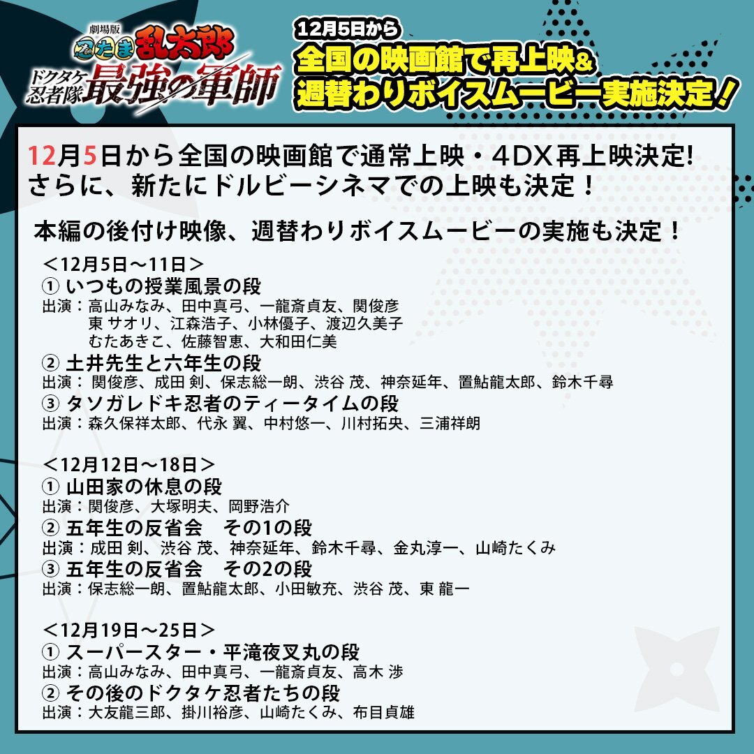 今週12月5日(金)より『劇場版 忍たま乱太郎 ドクタケ忍者隊最強の軍師』が全国の映画館で再上映! 通常版の再上映と4DX版の再上映に加えて、新たに制作されたドルビーシネマ版の上映も実施! 本編の後付け映像、全8種の週替わりボイスムービーも実施! sh-anime.shochiku.co.jp/nintama-movie/… pic.x.com/NVYXhODuAL