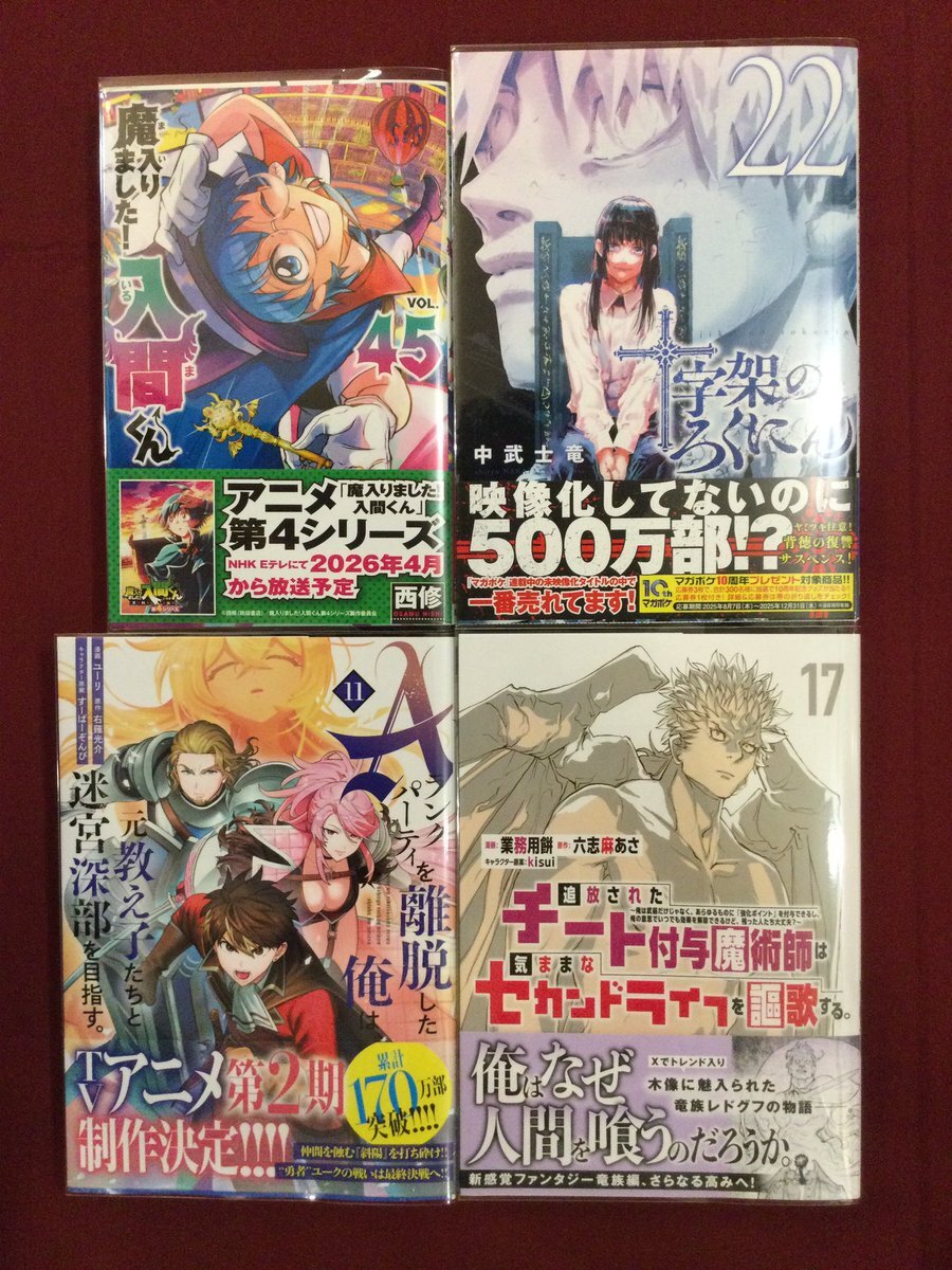 本日入荷☁️ #今日買った漫画 魔入りました!入間くん(45) 十字架のろくにん(22) Aランクパーティを離脱した俺は、元教え子たちと迷宮深部を目指す。(11) 追放されたチート付与魔術師は気ままなセカンドライフを謳歌する。(17) 転生したらスライムだった件(30) 薫る花は凛と咲く(20) pic.x.com/InixynNsuC