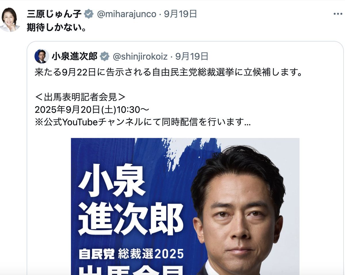 返信先:@asao_keiichiro1〈ようやく真打登場!〉 〈総裁まちがいなし〉 〈あの石破さんを説得できたのスゴい〉 〈泥臭い仕事もこなして一皮むけたのね〉 〈去年より渋みが増したか〉 〈ビジネス保守に負けるな〉 〈やっぱり仲間がいない政策は進まないよ〉