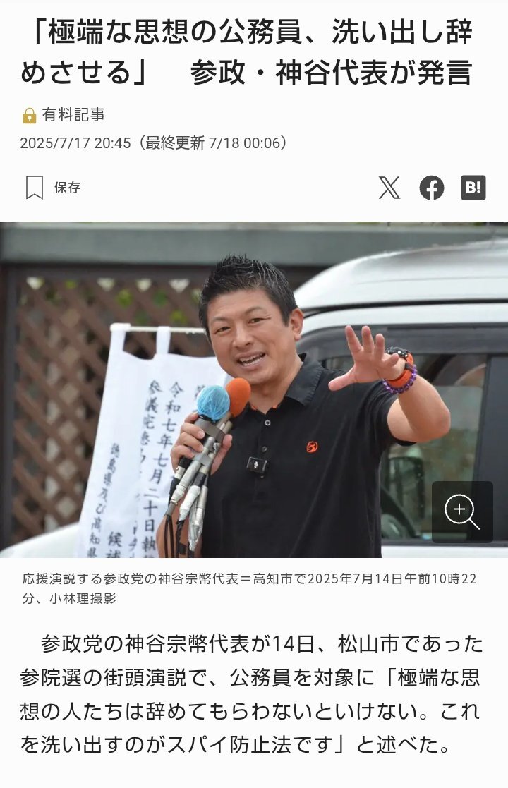 こういう考えの人間が権力を握ったり、こういうのに共感する人間が権力に接近すれば危険性は増すんだよ。 「極端な思想の公務員、洗い出し辞めさせる」 参政・神谷代表が発言 治安維持法「理念間違っていない」 参政代表、スパイ防止法に絡み:時事ドットコム jiji.com/jc/article?k=2… pic.x.com/FzgQPkRiCv x.com/minaminpyo/sta…