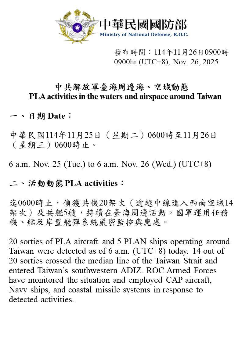 20 sorties of PLA aircraft and 5 PLAN vessels operating around Taiwan were detected up until 6 a.m. (UTC+8) today. 14 out of 20 sorties crossed the median line and entered Taiwan’s southwestern ADIZ. We have monitored the situation and responded.