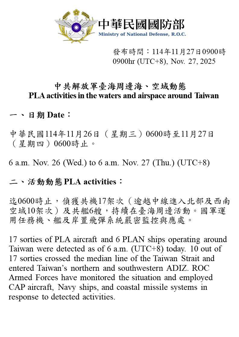 17 sorties of PLA aircraft and 6 PLAN vessels operating around Taiwan were detected up until 6 a.m. (UTC+8) today. 10 out of 17 sorties crossed the median line and entered Taiwan’s northern and southwestern ADIZ. We have monitored the situation and responded.