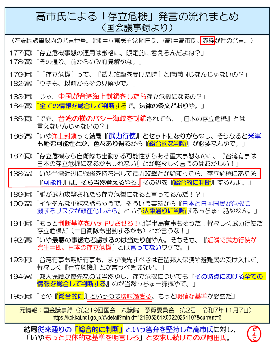 1. 遂に日本の首相が中国の野望に対し日本の立ち位置を示したにすぎず。イオン君が誘導尋問したから。 2. 存立危機事態は中国が先制攻撃した場合を機とする。国防対策を無防備にする国のトップは世界に存在しない。 3. 台湾有事=中国が台湾/台湾周辺の日本領域/海域に先制攻撃すること。米国も警戒中。 x.com/okada_katsuya/…