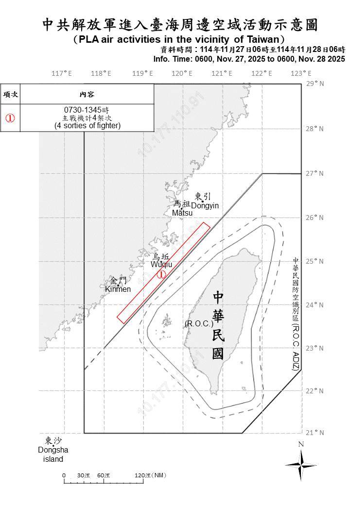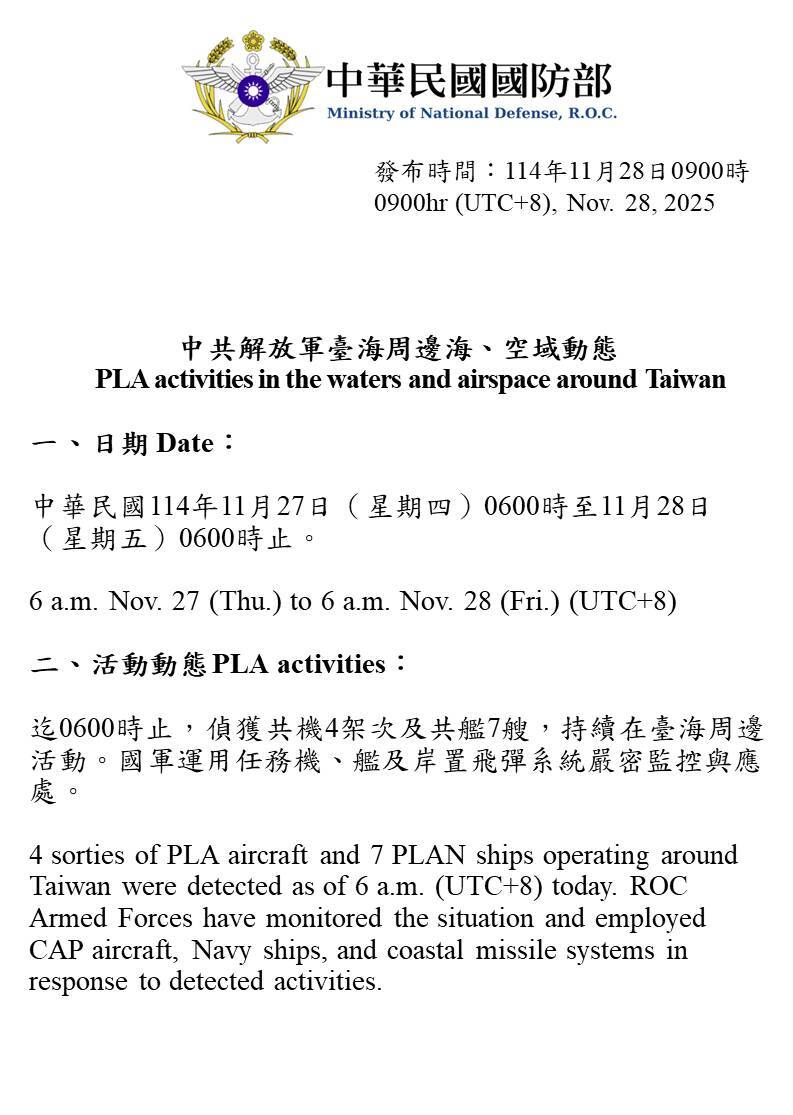 中華民国(台湾)国防部発表|現地時間2025.11.28 09:00 現地時間2025.11.27 06:00〜2025.11.28 06:00に台湾周辺で確認された中国側航空機・艦艇 ◾️PLA(人民解放軍)航空機:4 ◾️PLA海軍艦艇:7 上記期間に台湾のADIZ(防空識別圏)内に進入したPLA航空機はなかった。 pic.x.com/Ubr2HtIxuQ x.com/MoNDefense/sta…