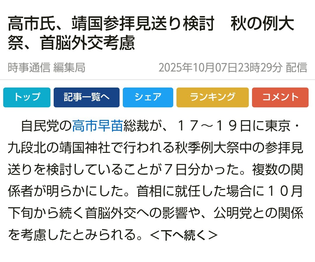 【速報】高市氏、秋の靖国参拝見送りで調整 47news.jp/13261310.html?…