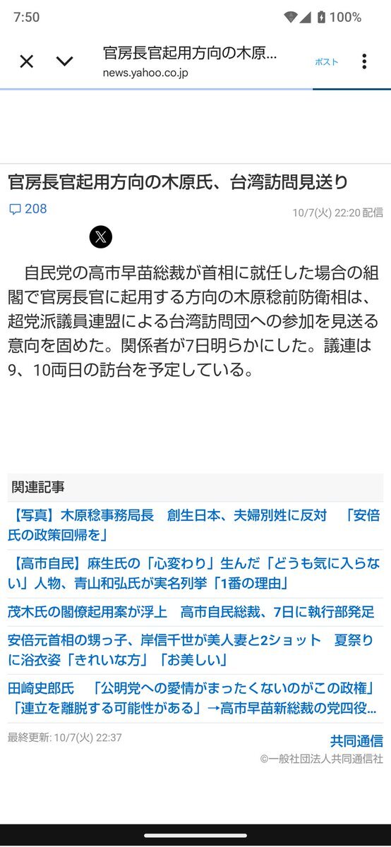これも公明の影響か? 【速報】官房長官起用方向の木原氏、台湾訪問見送り #47NEWS 47news.jp/13261616.html @47news_officialより