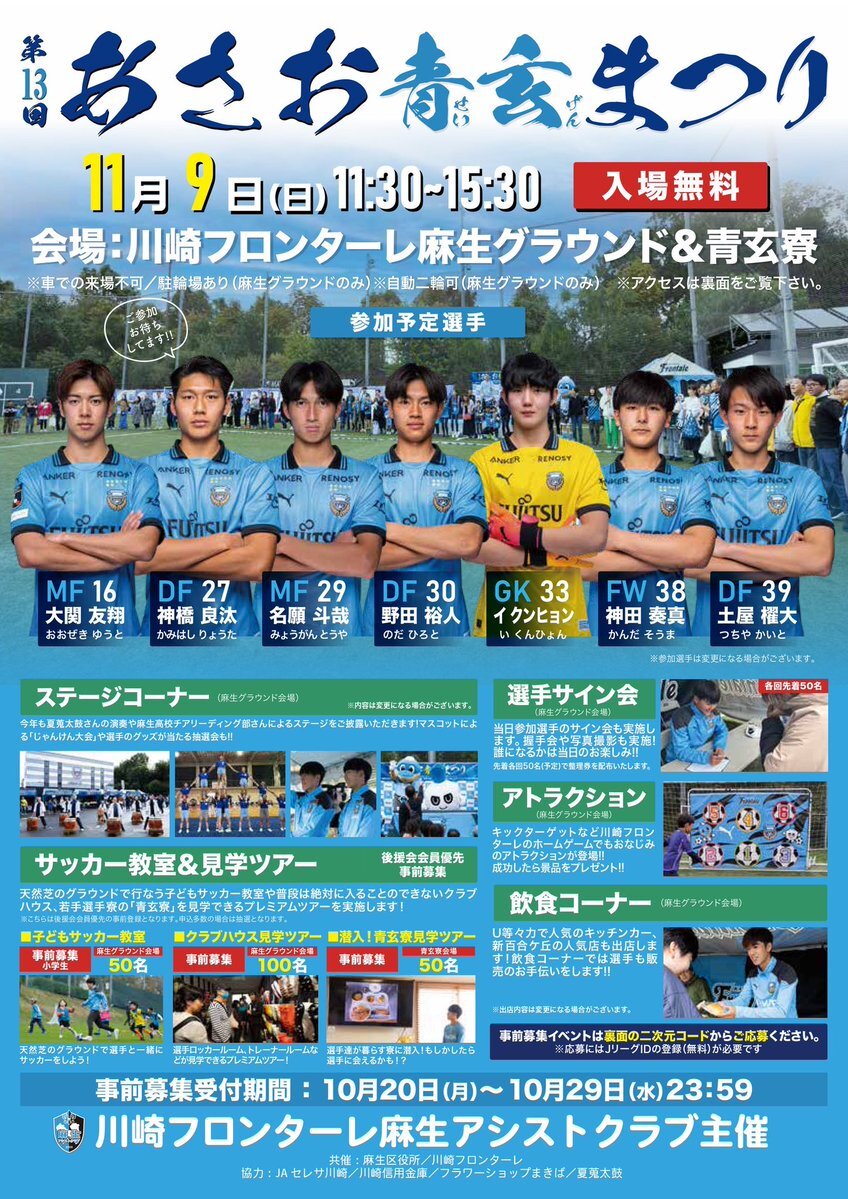 大関友翔、土屋櫂大の両選手がU-22日本代表のイングランド遠征メンバーに選出。 このため、参加予定の第13回 あさお青玄まつりは欠席する事に。 神橋良汰、野田裕人、イ・クンヒョン、神田奏真の4選手で実施予定だそうです。 x.com/frontale_staff…