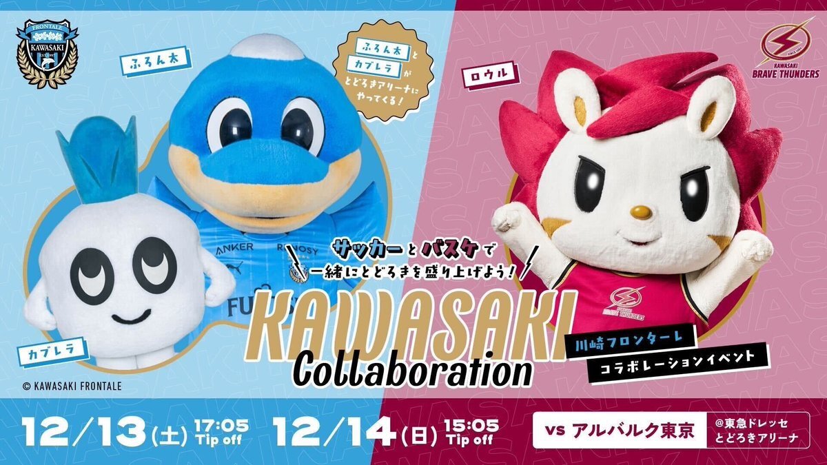 チケット販売順次スタート📣 12/13(土),14(日) アルバルク東京戦 本節は年に一度の川崎フロンターレコラボデイズ🐬⚽ 当日はふろん太とカブレラがとどろきアリーナに応援に駆けつけてくれます✊ サッカーとバスケで一緒に川崎を盛り上げる🎉 kawasaki-bravethunders.com/news/detail/id…