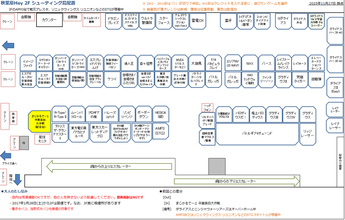 まじかるでーと 卒業告白大作戦 の配信が始まったので秋葉原Heyの配置図を更新した。 秋葉原Hey 2Fシューティング島の配置 2025-11-27 blog.mdnomad.com/2025/11/27/aki… pic.x.com/MIzLaMNlpk