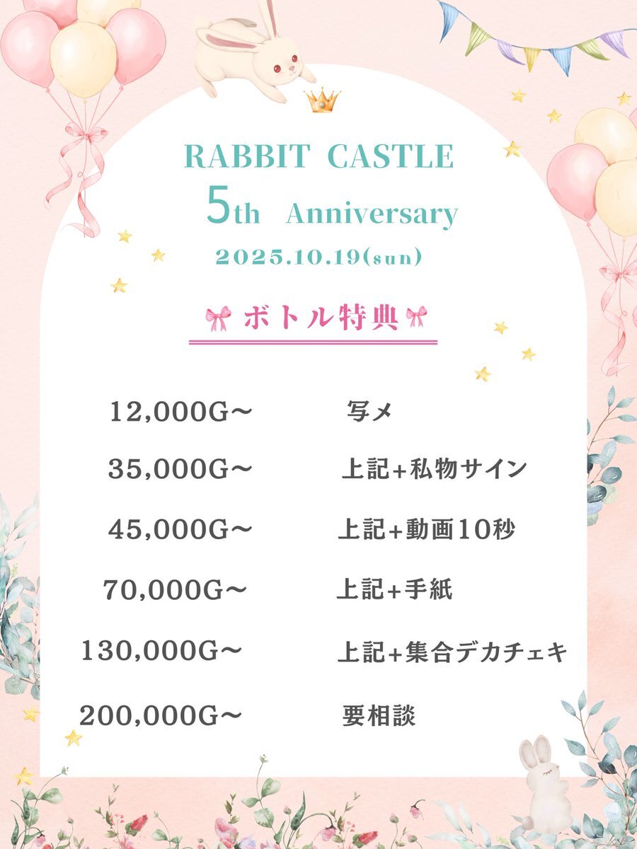 【🐰周年イベントのお知らせ🏰】 10月にRABBIT CASTLEは5周年を迎えました🔑✨ いつもありがとうございます💖 5周年を記念し、10/19(日)に周年イベントを開催します🥳 イベント当日は私服でお給仕します👗✨ イベント限定の特典もございますので詳しくは画像をご覧ください💖 pic.x.com/FtMPnMs2sf