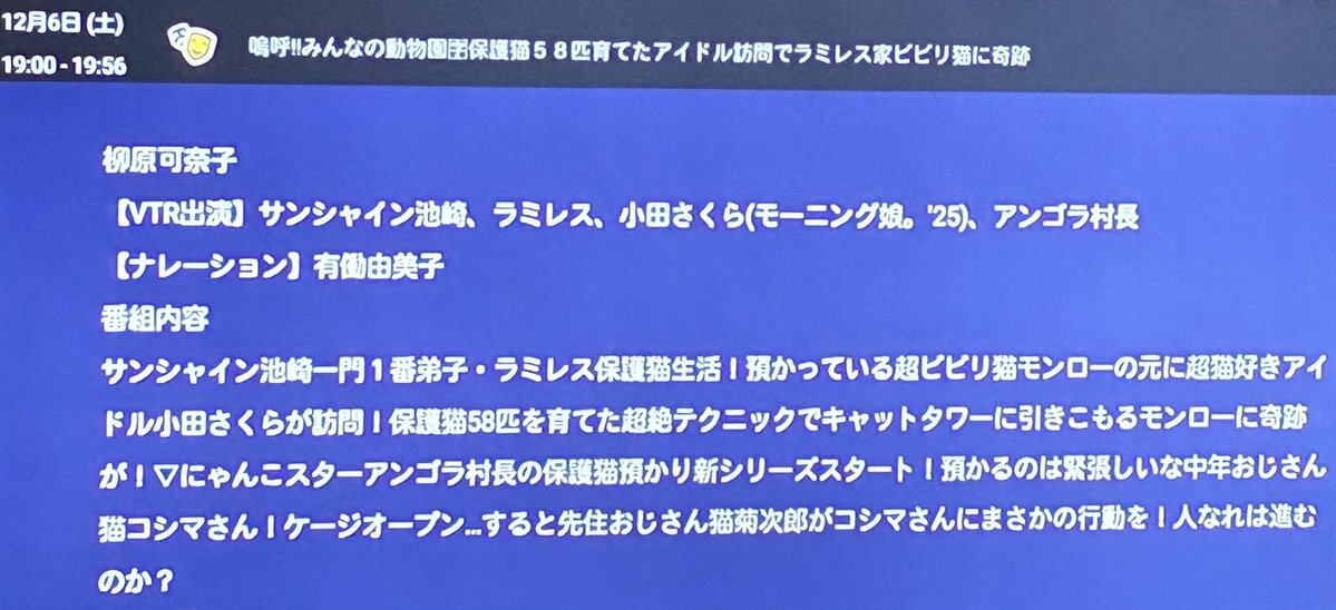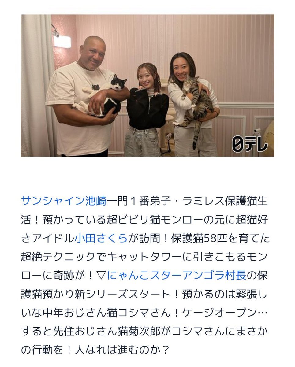 嗚呼!!みんなの動物園 保護猫58匹育てたアイドル訪問でラミレス家ビビリ猫に奇跡 日テレ 12月6日(土曜) 19:00-19:56 bangumi.org/tv_events/seas… 「サンシャイン池崎一門1番弟子・ラミレス保護猫生活!」のコーナーに出演するのか。ラミレスと小田ちゃんの並びは新鮮 #モーニング娘25 #小田さくら x.com/MorningMusumeM…