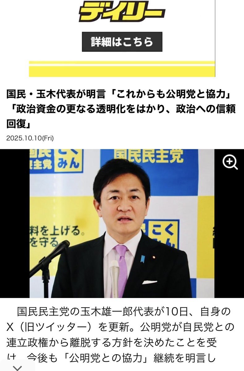本性現れたな‼️ 国民・玉木代表「これからも公明党と協力して取り組んでいければ」連立解消の激震にスピード反応 news.livedoor.com/article/detail…