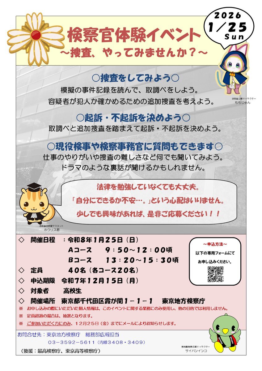 【東京地方検察庁】 検察官体験イベント開催!(初!高校生対象) ~捜査、やってみませんか?~ 令和8年1月25日(日)、捜査体験イベントを開催します★ 高校生の皆さん!是非ご応募ください! ↓申込フォーム↓ ※申込期限:12月15日(月) forms.gle/PSPd3E2uXXGhZ1… pic.x.com/fBglkbYVu1