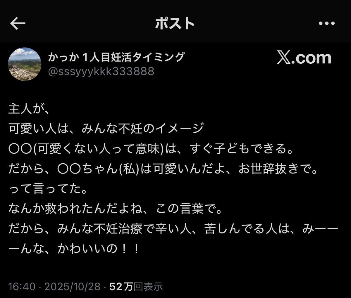 治療開始9月〜の時点で義姉妊娠してるのにムカつく思考理解できん、治療中に誰かが妊娠して羨ましい!ならまだ分かるけど既に妊娠してだいぶ経ってる相手に残念なお産を望む攻撃性を先にどうにかすべきだと思う。てか2ヶ月でここまで不安定、攻撃的になるの先が思いやられる…そっちの治療が先やろ… x.com/sssyyykkk33388…