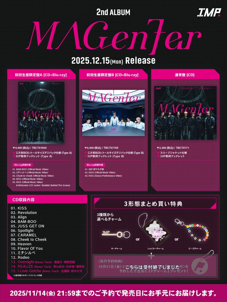 / IMP. 2nd ALBUM「MAGenter」 12月15日(月)発売!!!!!!! \ ◤ 3形態まとめ買い特典 ◢ 3種類から選べるチャーム ご予約はこちら💿 ▷tobe-store.jp/pages/magenter 11月14日(金)21:59までのご予約で 発売日にお手元にお届けします📦✨ #MAGenter_IMP. #KISS_IMP.