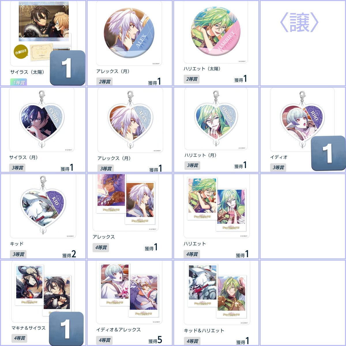 【交換】夢職人と忘れじの黒い妖精 ほしくじ セレクションくじ ゆめくろ 【譲】 1等 ハリエット(月)ファズ キッド 3等 エミリオ(太陽) サイラス(太陽) 4等 マキナ&サイラス 【求】 同賞 アレックス イディオ ・固定ポストお手渡し または 郵送 お気軽にお声がけください! pic.x.com/jccEkyGxf1