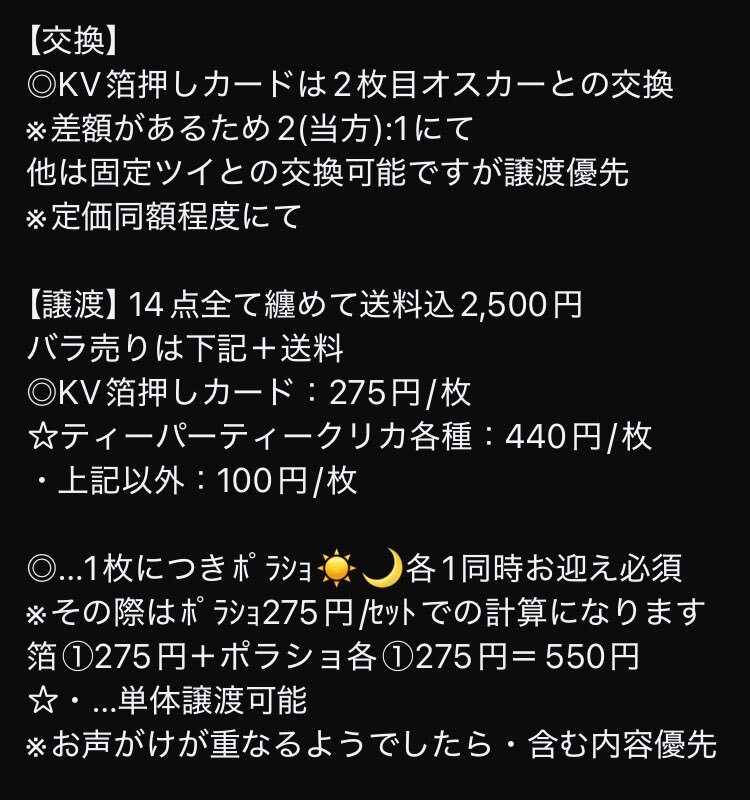 【交換/譲渡】ゆめくろ 夢職人と忘れじの黒い妖精 KV箔押しカード ポラショ 特典 クリアカード 譲:オスカー 求: 14点纏めて送料込2,500円 or 2枚目異種オスカー > ~定価+送料 or 固定ツイ ※詳細は3枚目 郵送のみ ゆうちょ振込 or メルペイ送金 よろしくお願いします #零菜_取引 pic.x.com/OrWlvtr75S