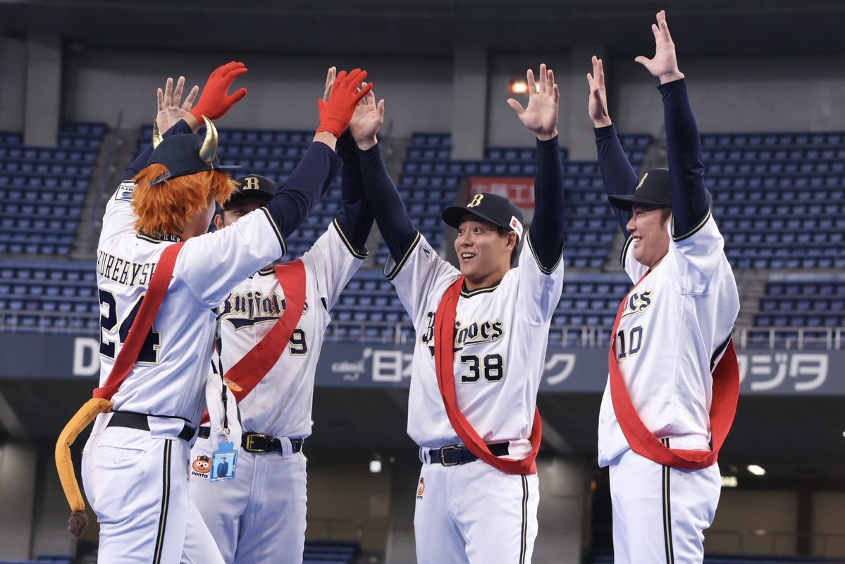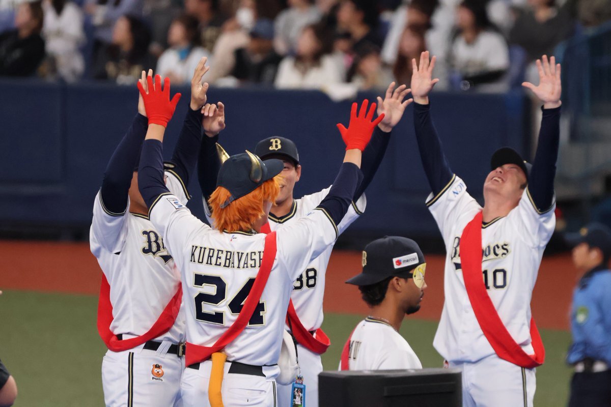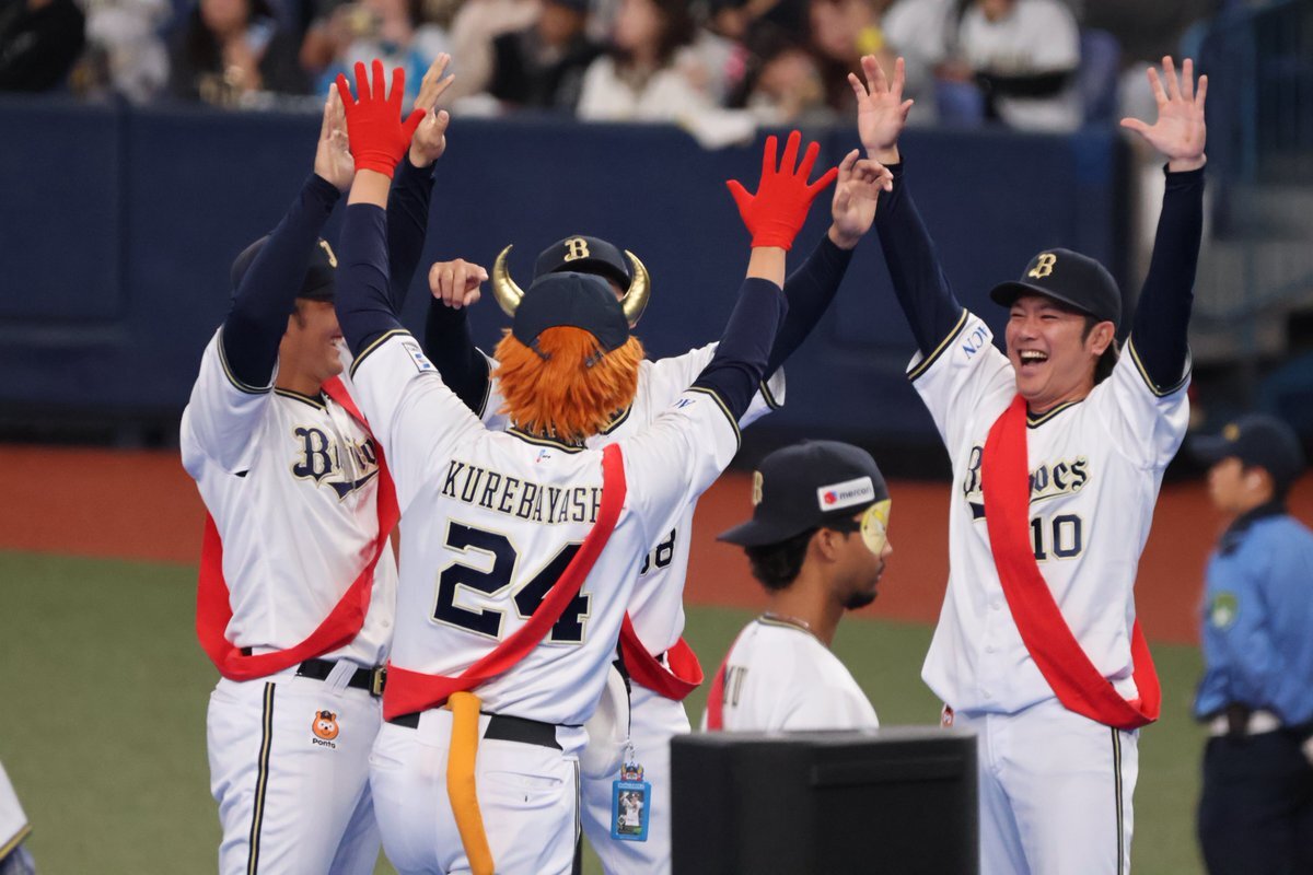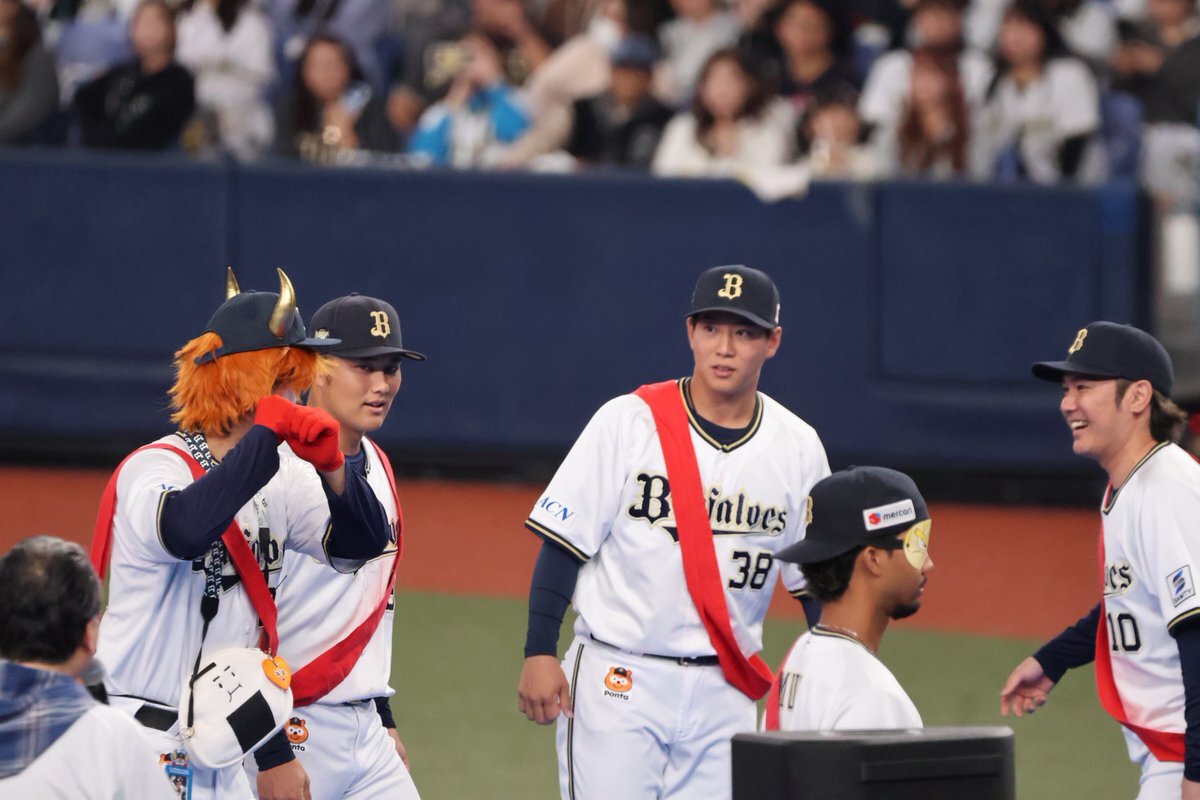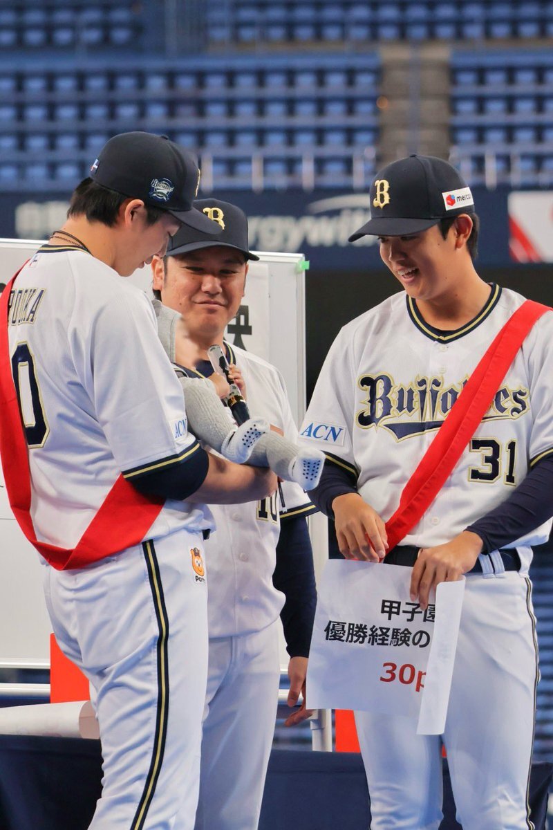 何故そこで共に喜んだんや🤣🤣🤣 #お題はサヨナラホームラン #ベニはバッター #だって嬉しいんだもの #紅林弘太郎 #野口智哉 #来田涼斗 #大城滉二 #Bsファンフェスタ pic.x.com/aJIlXQDOup