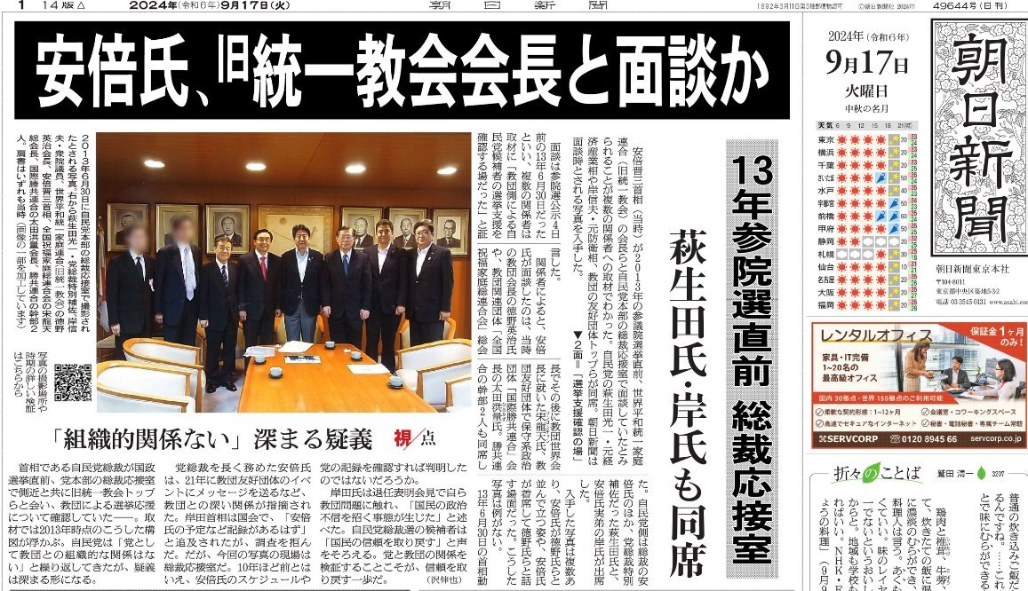 【独自】安倍晋三氏と旧統一教会会長、自民党本部で選挙支援確認か 写真入手 asahi.com/articles/ASS9J… 安倍晋三首相(当時)が2013年の参議院選挙直前、世界平和統一家庭連合(旧統一教会)の会長らと自民党本部の総裁応接室で面談していたとみられることが複数の関係者への取材でわかりました。 pic.x.com/DiAWoKckGG