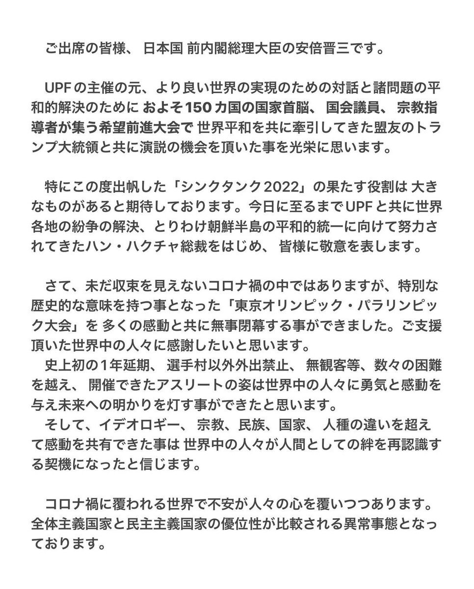 > 今日に至るまでUPFと共に世界各地の紛争の解決、とりわけ朝鮮半島の平和的統一に向けて努力されてきたハン・ハクチャ総裁をはじめ、皆様に敬意を表します。 アホくさ。社交辞令じゃん x.com/mo20zupfzz3gjt…