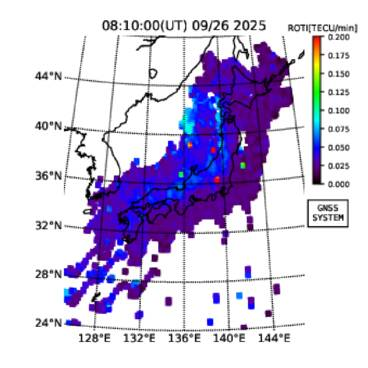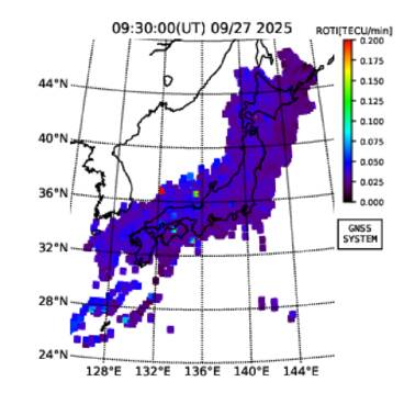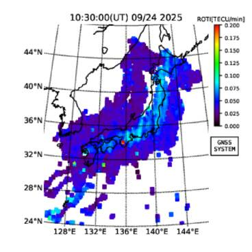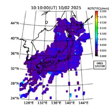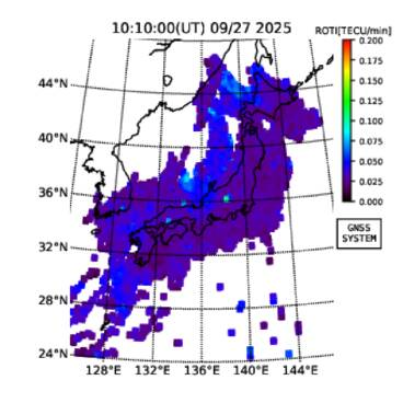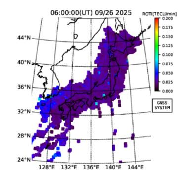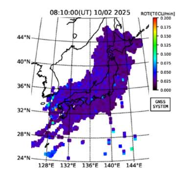 (電子数・続)長野、岐阜・福井、福井沖(黄)、伊豆、遠州灘、四国沖、滋賀、淡路島付近、兵庫、鳥取、島根・山口、高知、愛媛、大分、日向灘、五島列島近海、薩南諸島東方沖(赤) <広範囲><小>関東東方沖~八丈島東方沖(線状)、房総半島南方沖、沖縄近海辺り、宮古島近海 大気重力波▶︎なし