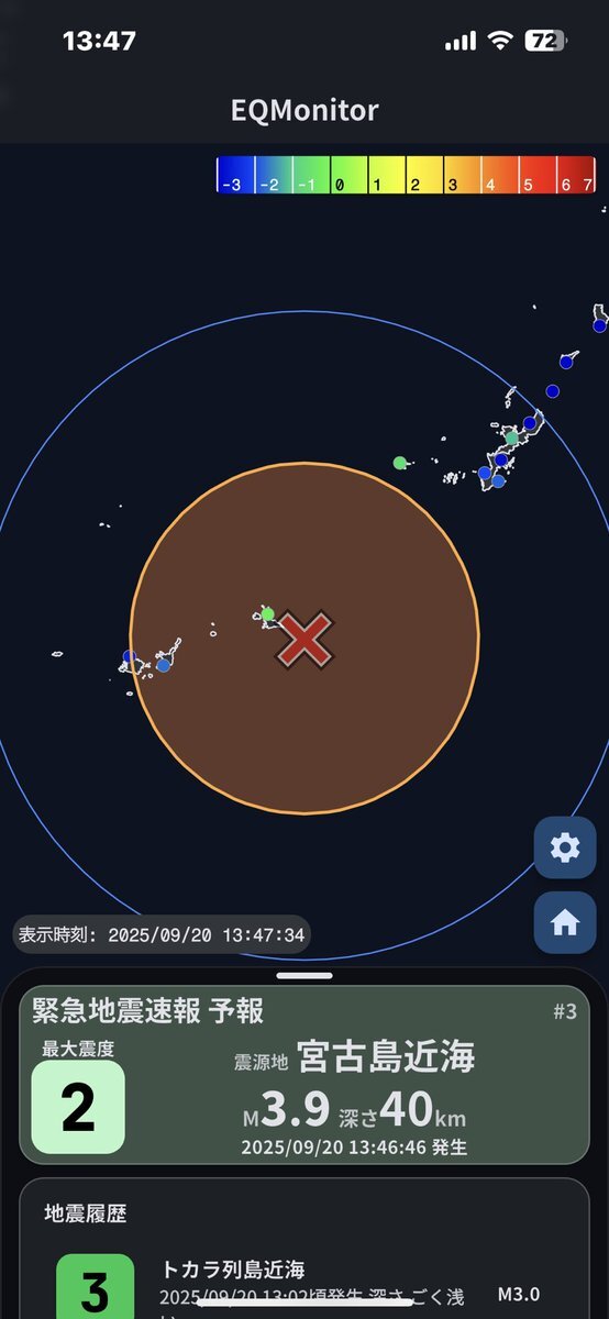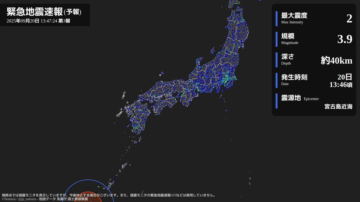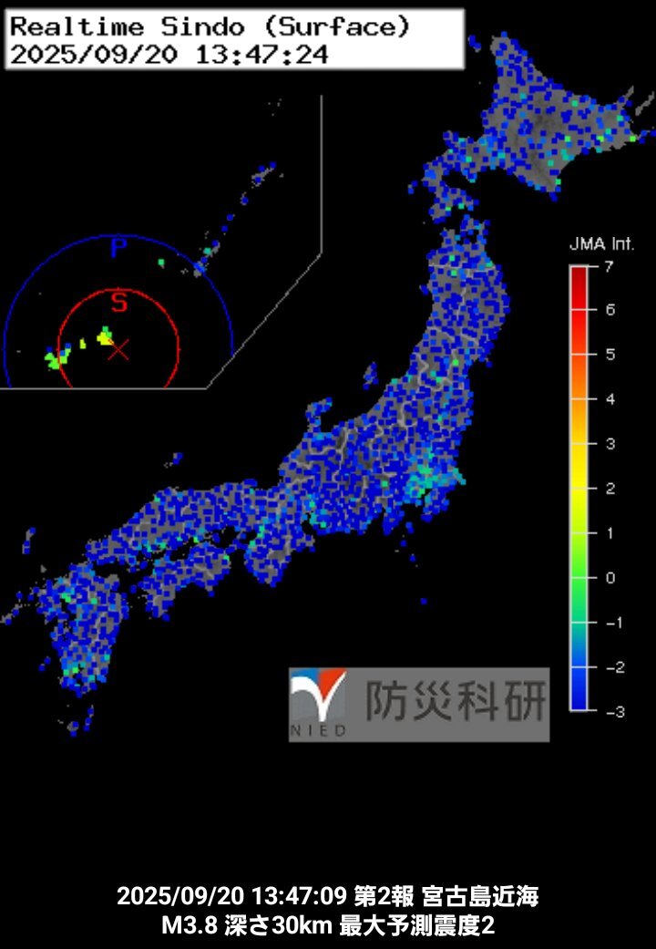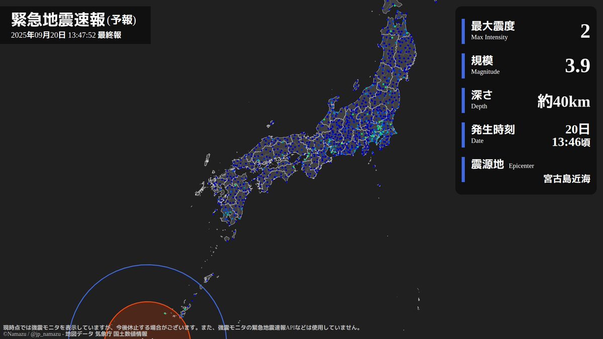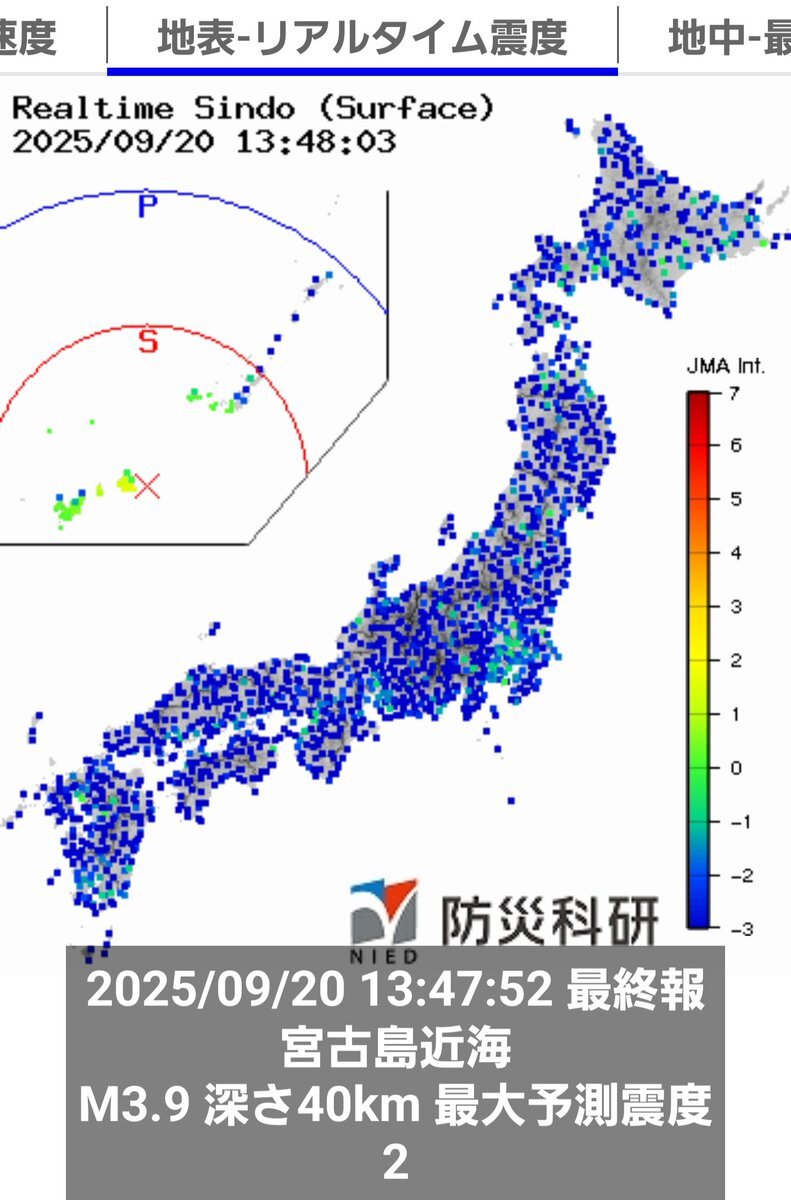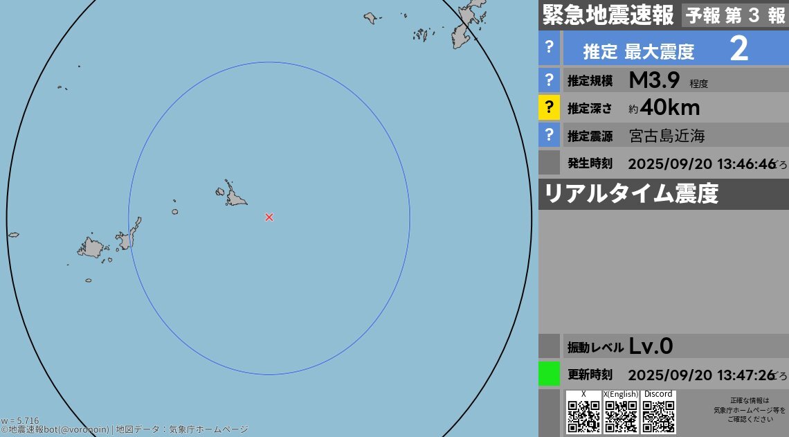 ■■緊急地震速報(第3報)■■ 宮古島近海で地震 最大震度 2(推定) [詳細] 2025/09/20 13:46:46発生 M3.9 深さ40km #earthquake #緊急地震速報