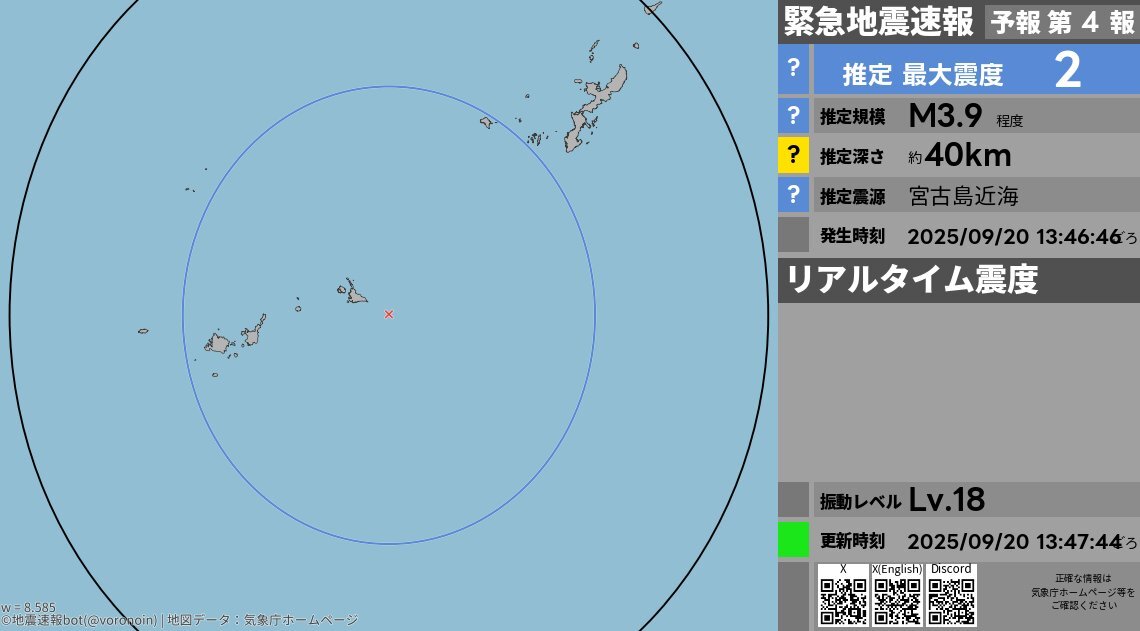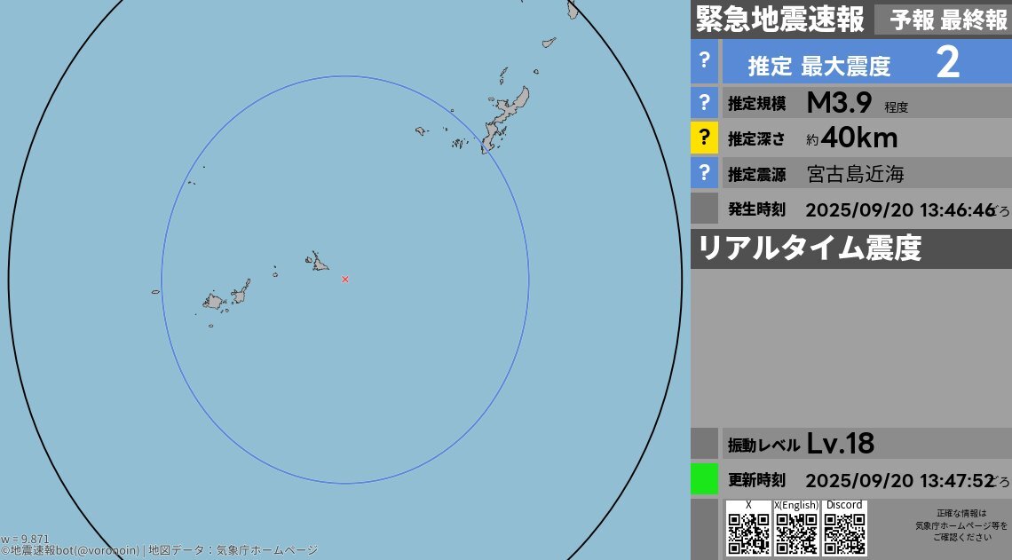 ■■緊急地震速報(最終報)■■ 宮古島近海で地震 最大震度 2(推定) [詳細] 2025/09/20 13:46:46発生 M3.9 深さ40km #earthquake #緊急地震速報