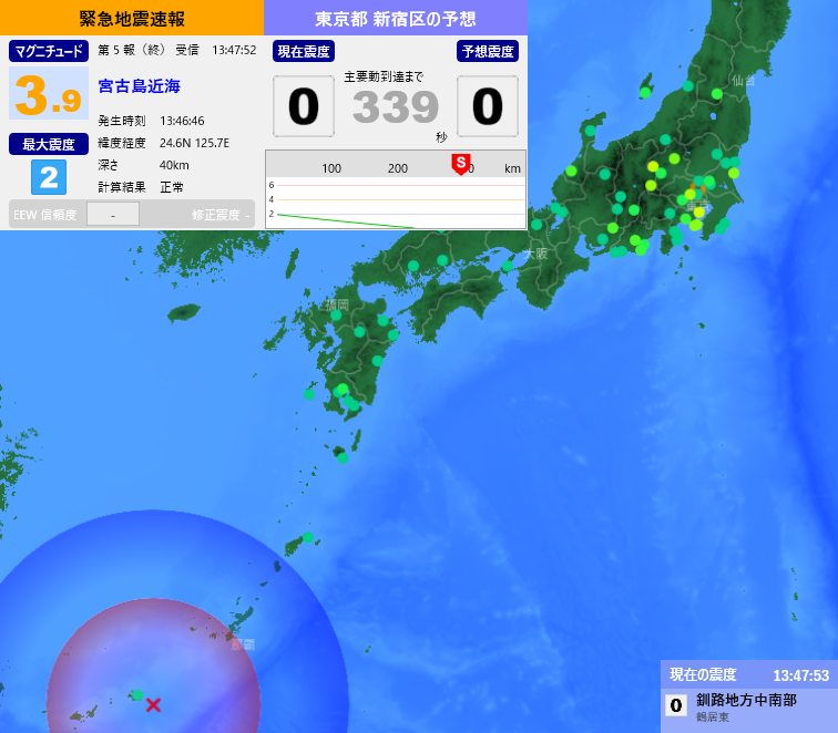 【緊急地震速報】推定最大震度2(第5報) 13:46:46頃宮古島近海を震源とする地震が発生。推定規模M3.9、深さ約40km程度。 【最終報】