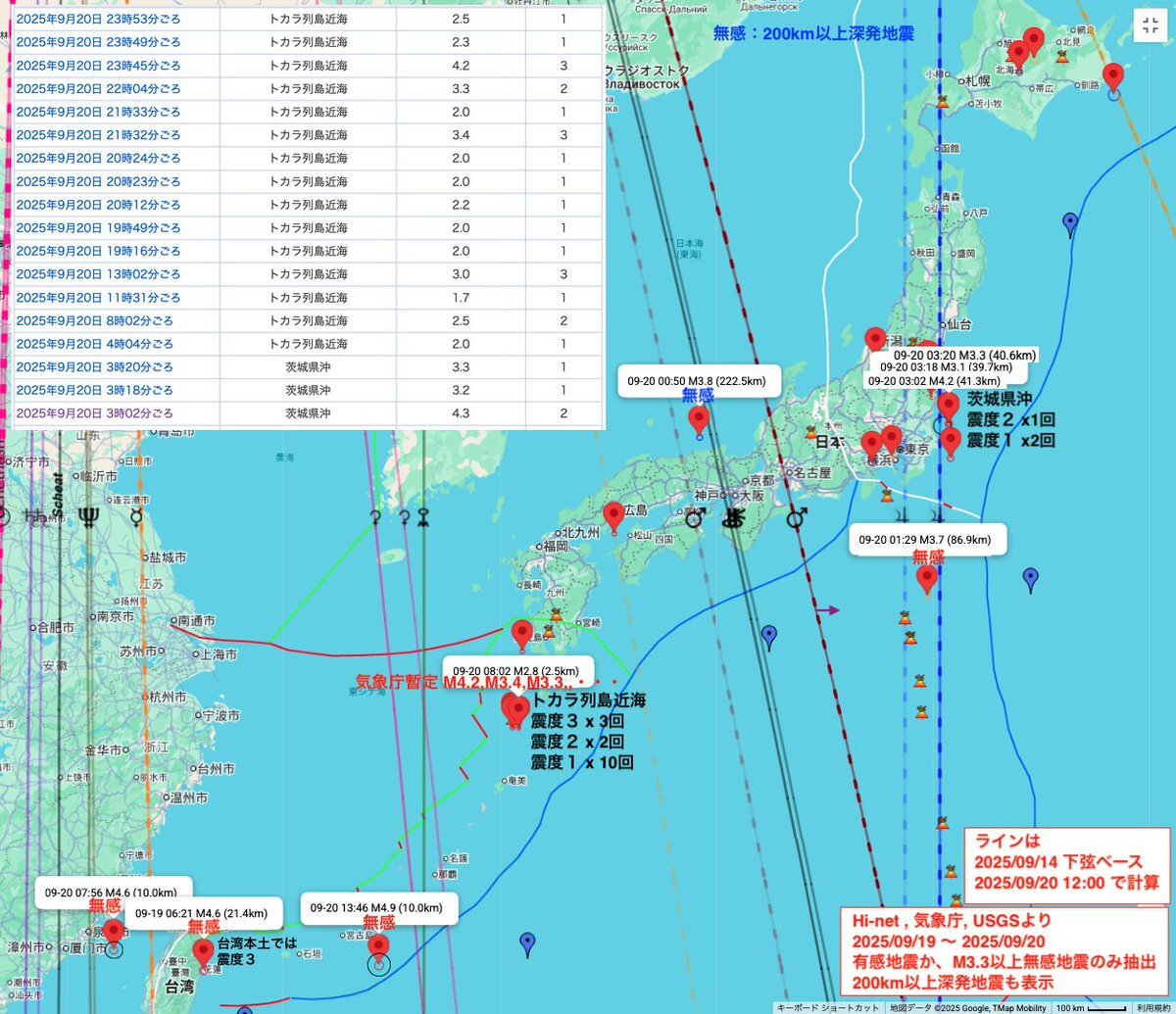 2025/09/20 有感地震は全部で18回で、最大は茨城県沖M4.3(震度2) この茨城県沖の同じ震源近くで18分間に3回の有感地震があり、緊急ニュースが未明に出ていた あと、他の15回の有感は全てトカラ列島近海で、最大でM4.2(震度3)もあり、活発な1日だった それ以外は、宮古島近海でM4.9無感地震 pic.x.com/OEroUS3CZI