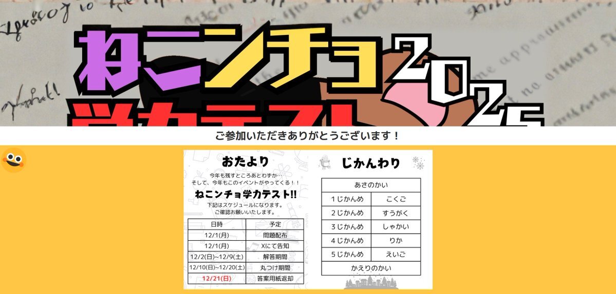 【年末企画告知】 🐈ねこンチョ学力テスト2025🦝 本配信:12/21(日) 🏫今年も開校🏫 生徒は12月2日~12月9日の期間、配信上で問題を解いて頂きます!! 推しの配信者とともに問題を解いてみよう🧑‍🎓 ※コメントで匂わせ、ヒントはやめてね☑ 生徒はツリーで後日告知☑ #ねこンチョ学力テスト2025