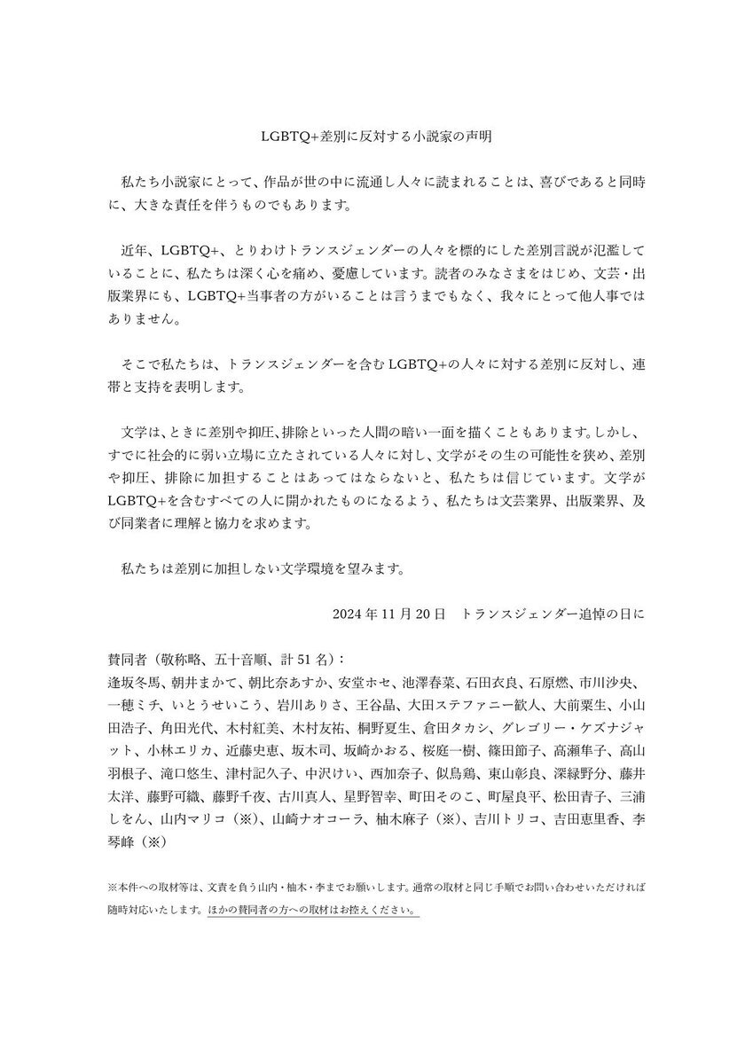 文学がすべての人にとって開かれたものでありますように。 小説家51名によるLGBTQ+差別反対声明を発表します。 出版業界が誰にとっても安心できる環境であるために、私たちに何ができるかを考えました。 是非ご一読いただけたら幸いです。