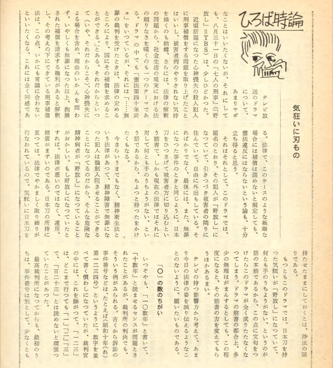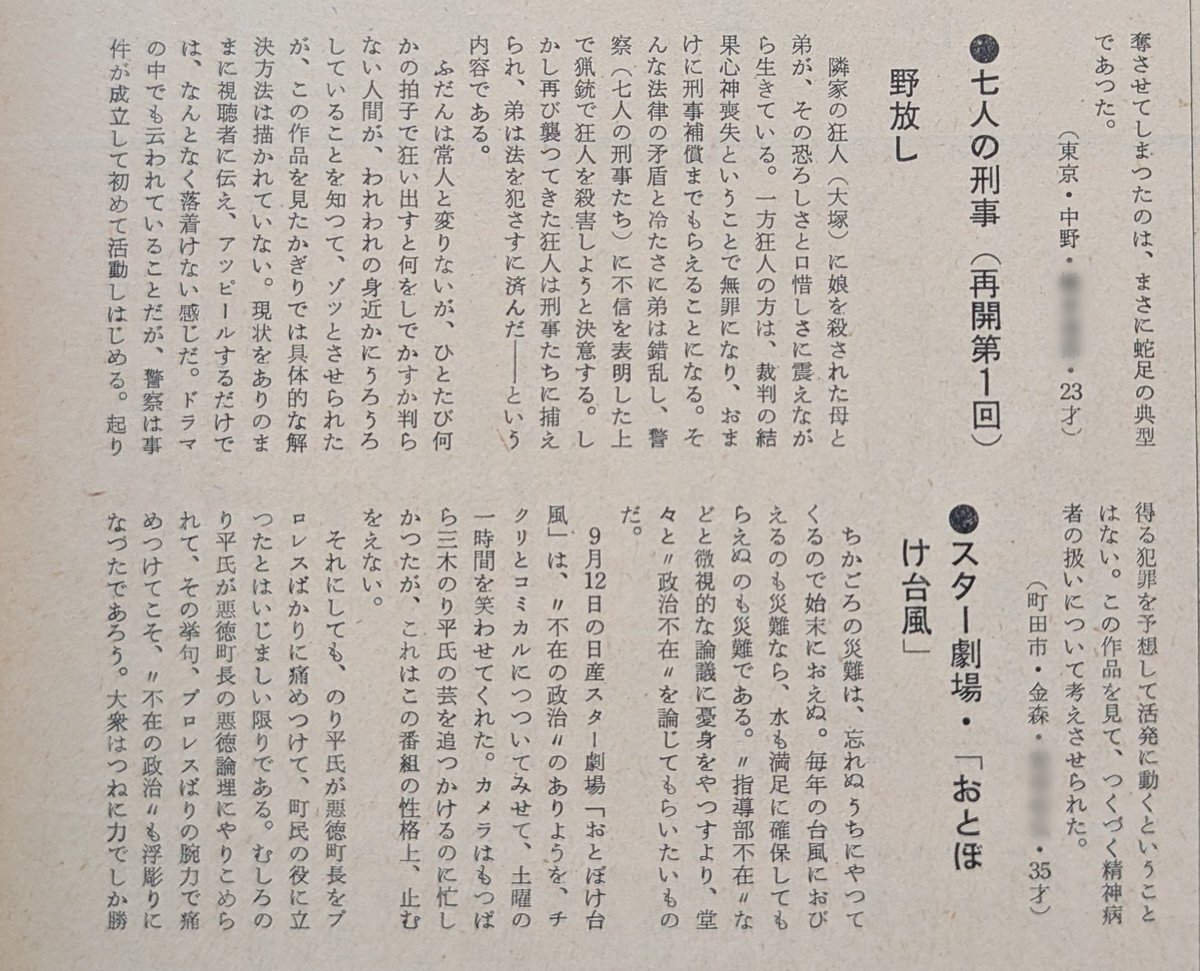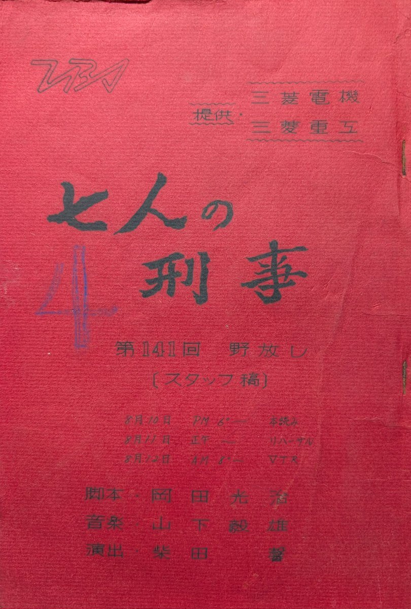 七人の刑事「野放し」の脚本を読む。時代を考慮しても精神障害に対する差別的な表現がきつい。また放送当時にも指摘されているように、やはりそもそもの設定に無理があると思う(似たようなテーマを扱った怪奇大作戦「狂鬼人間」は多分偶然だろうがこの欠点を補った形になっている)。 pic.x.com/VbIMuQB0oN
